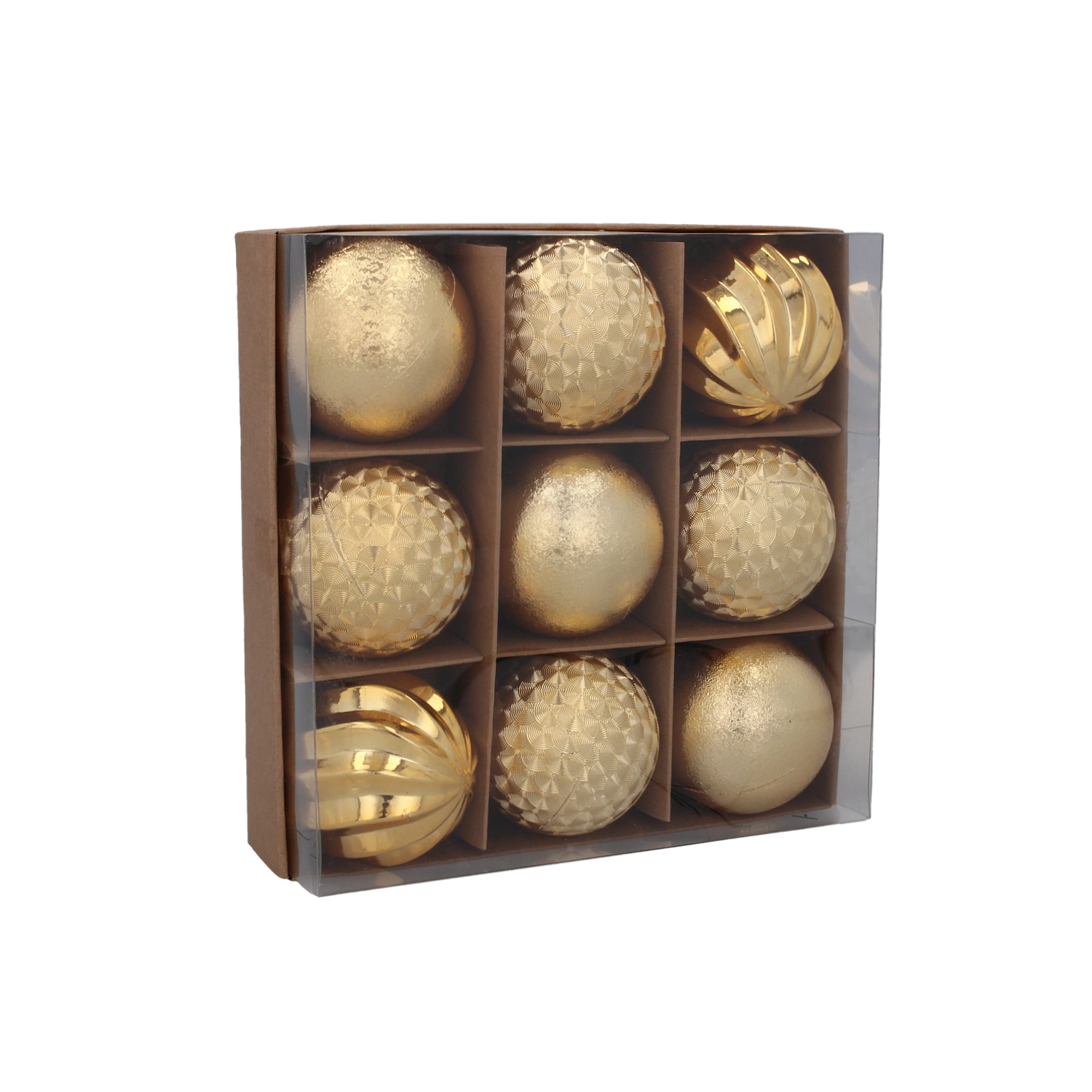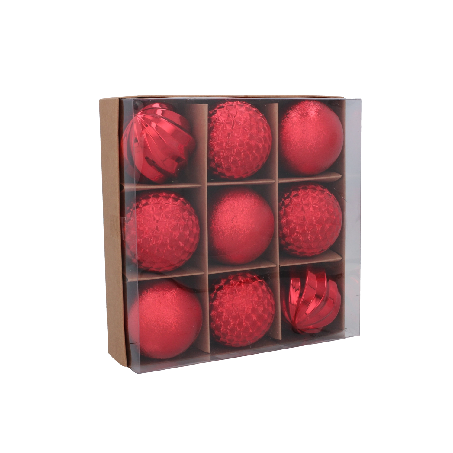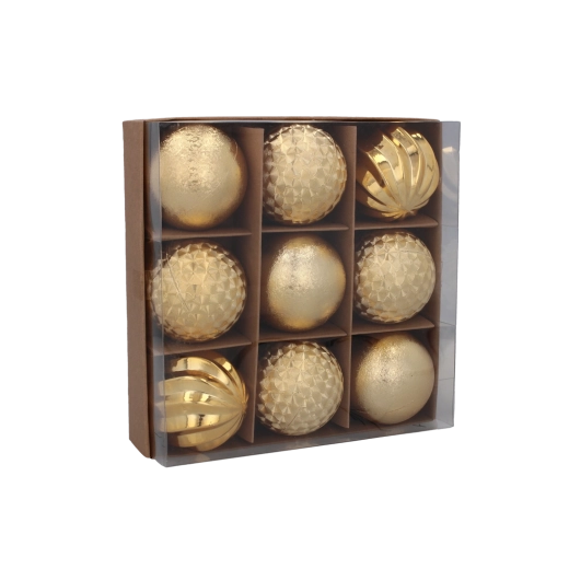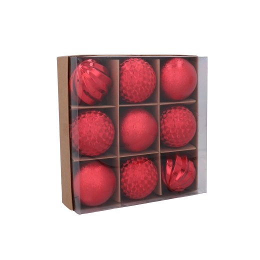 Elegáns, kilenc darabos karácsonyi gömbszett 6 cm átmérővel, piros, arany és ezüst színekben, amely hagyományos csillogást és harmonikus megjelenést kölcsönöz a fának. A tartós műanyag biztonságos kezelést biztosít, a különböző textúrák és minták mélységhatást keltenek, a könnyű kivitel pedig egyszerű felakasztást tesz lehetővé az ágak terhelése nélkül.