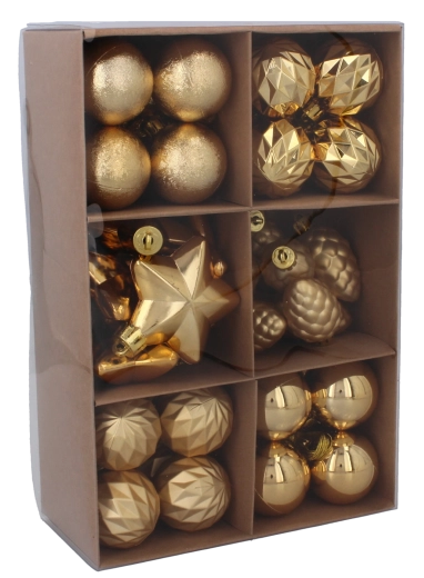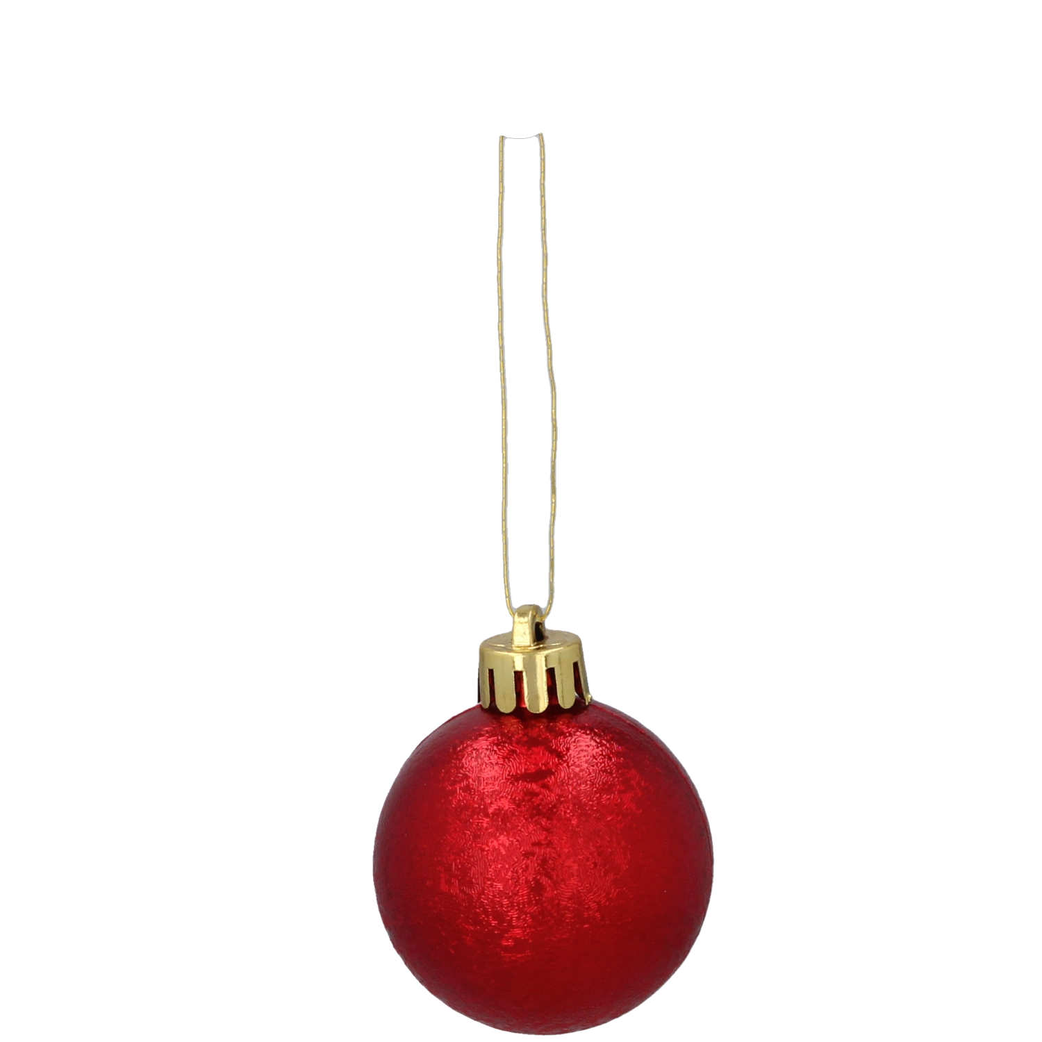 Elegáns 47 darabos karácsonyi díszkészlet 4–6 cm átmérővel, piros, arany és ezüst színben, amely hagyományos és stílusos megjelenést kölcsönöz a fának. A törésálló műanyagból készült díszek könnyűek, tartósak és biztonságosak gyerekek és háziállatok mellett is. A fényes és matt felületek, valamint a különböző formák kombinációja gazdag, harmonikus díszítést eredményez anélkül, hogy megterhelné az ágakat.
