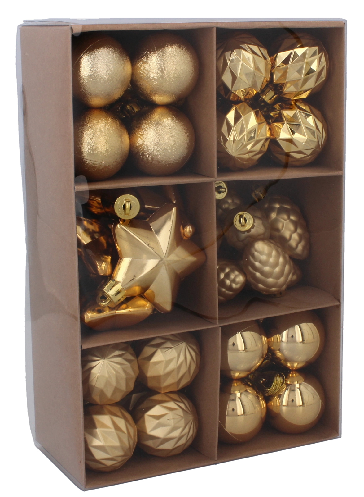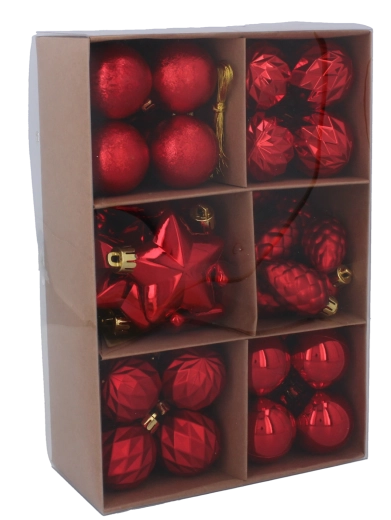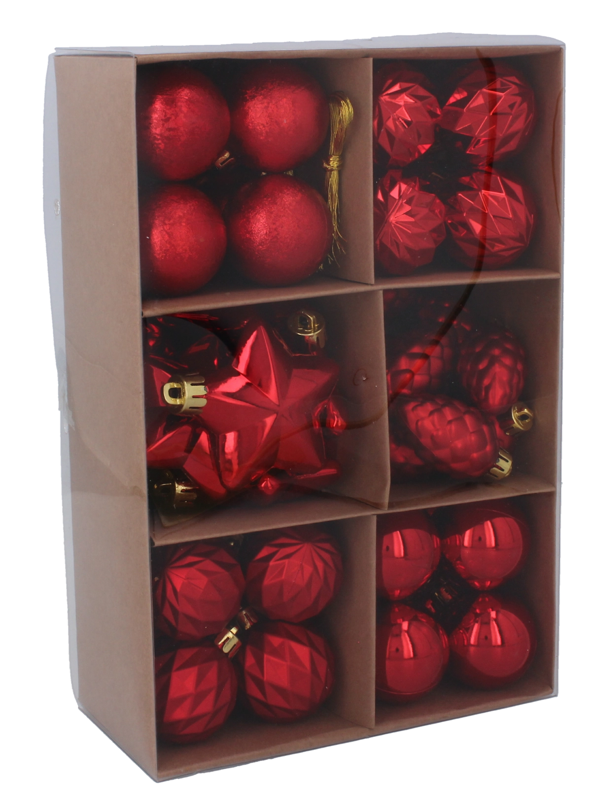 Ez a gazdag készlet gondosan válogatott formákat és felületkezeléseket kínál – a sima, magasfényű gömböktől a fazettált és strukturált díszeken, csillagokon és tobozokon át. A piros, arany és ezüst átgondolt keverésének köszönhetően könnyedén összehangolhatja a díszítést más dekorációkkal, és időtlen ünnepi hangulatot teremthet.