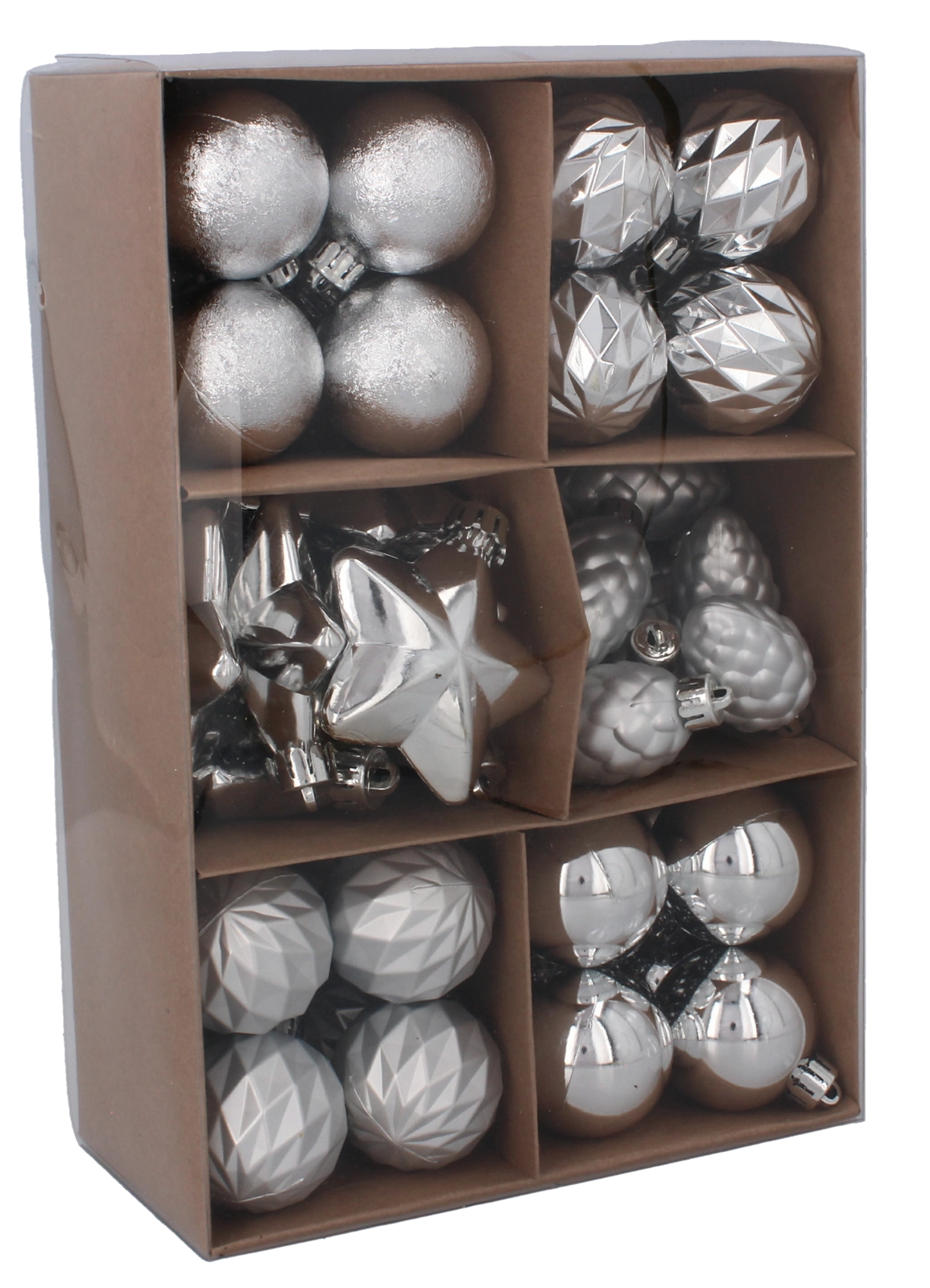Gömbök, csillagok és tobozok fényes, matt és fazettált kivitelben dinamikát adnak a fának, és szépen verik vissza a fényt.