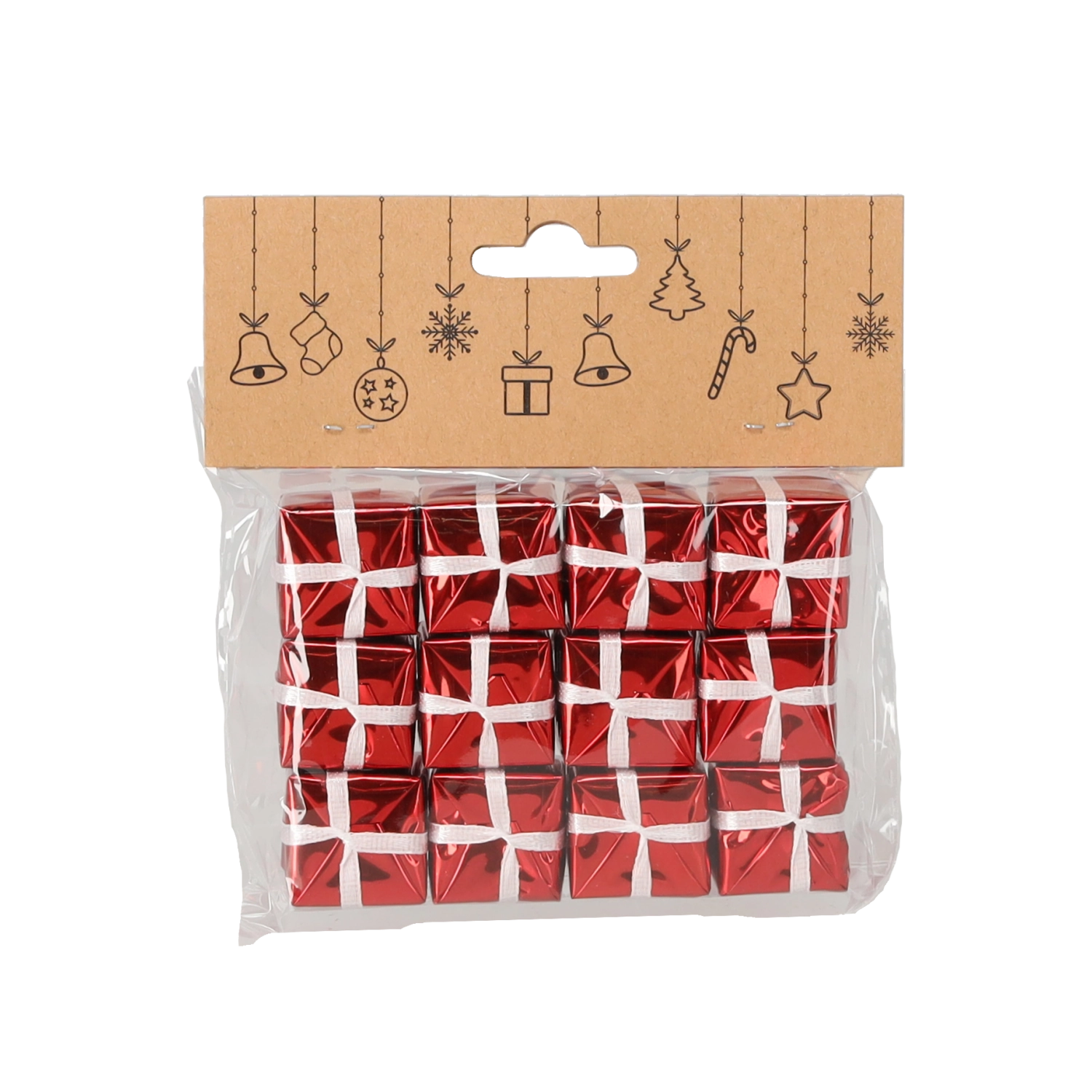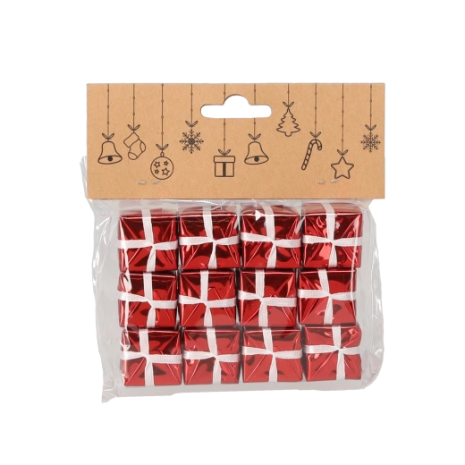 Az elegáns, 12 darabos minidísz-készlet ajándék formában finom csillogást és vizuális változatosságot kölcsönöz bármely karácsonyi dekorációnak. A kompakt, 2,5 cm-es méretnek és a könnyű kialakításnak köszönhetően ideálisak a faágakra, fényfüzérekre, girlandokra, asztali kompozíciókra vagy ajándékcsomagolások díszítésére.