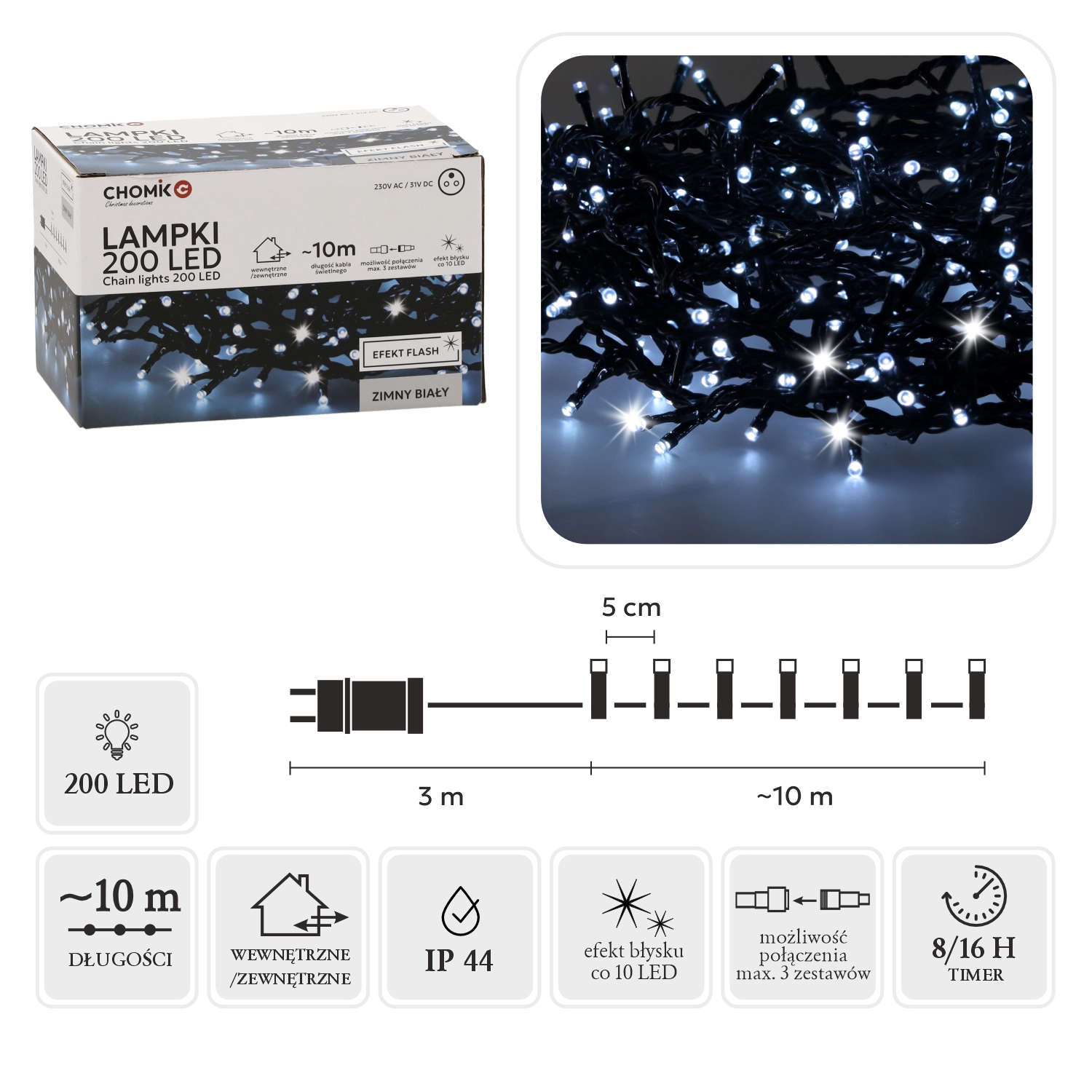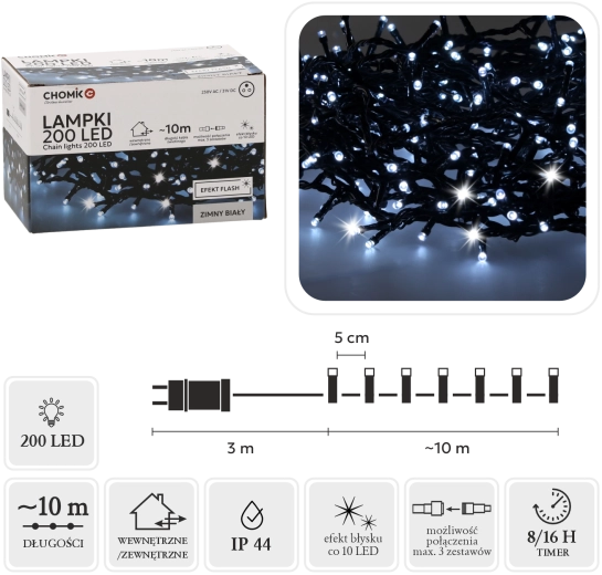 Stílusos fényfüzér 200 LED-del, hideg fehér színben és hideg villanás effektussal, amely beragyogja az otthont és a kertet. 10 m világító rész + 3 m betápkábel, memóriás programozó és 8/16 órás időzítő, folyamatos fény + flash üzemmódok, valamint IP44 védelem a biztonságos kültéri és beltéri használathoz.