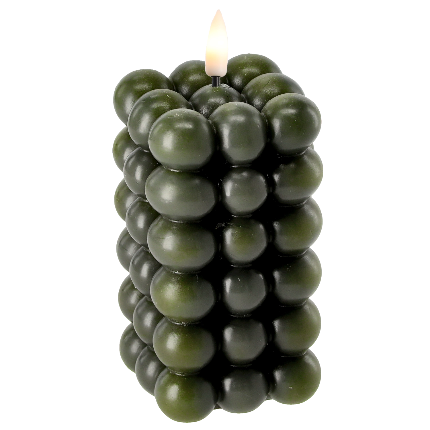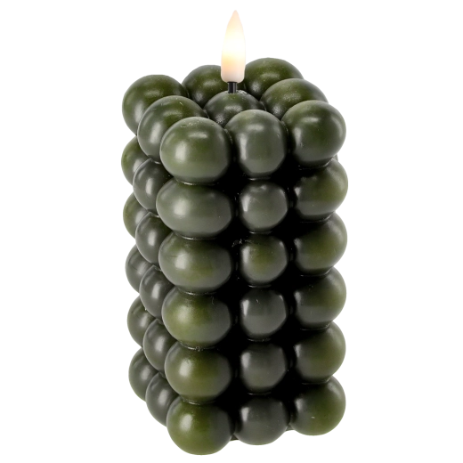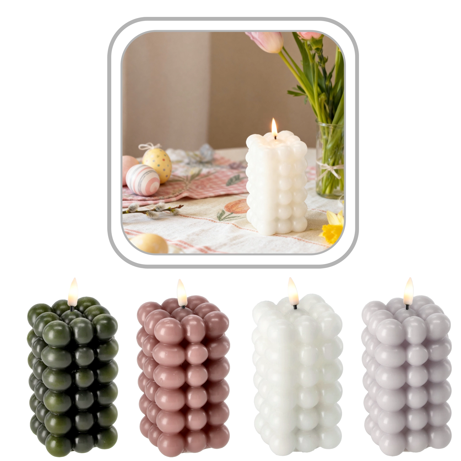 A dizájnos LED gyertya buborék (bubble) reliefes felülettel ötvözi a valódi viasz megjelenését a biztonságos, láng nélküli fénnyel. Több színben kapható, így könnyen illeszthető modern és klasszikus enteriőrökhöz is, és meghitt hangulatot teremt füst és nyílt láng kockázata nélkül – ideális gyermekes vagy háziállatos otthonokba.