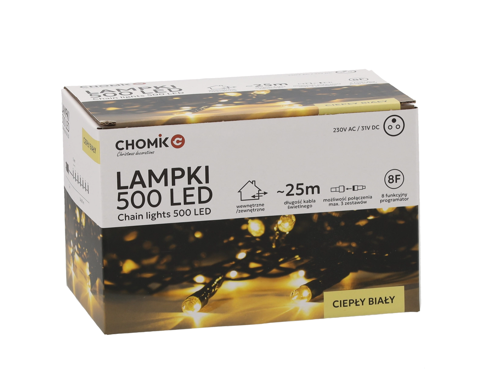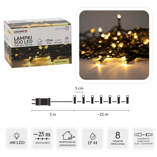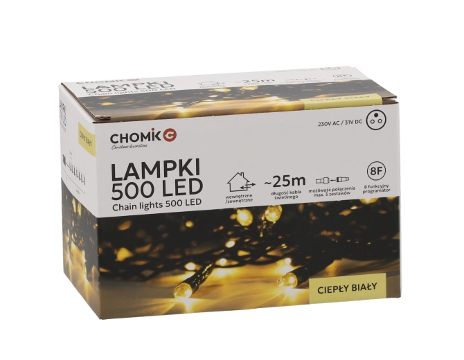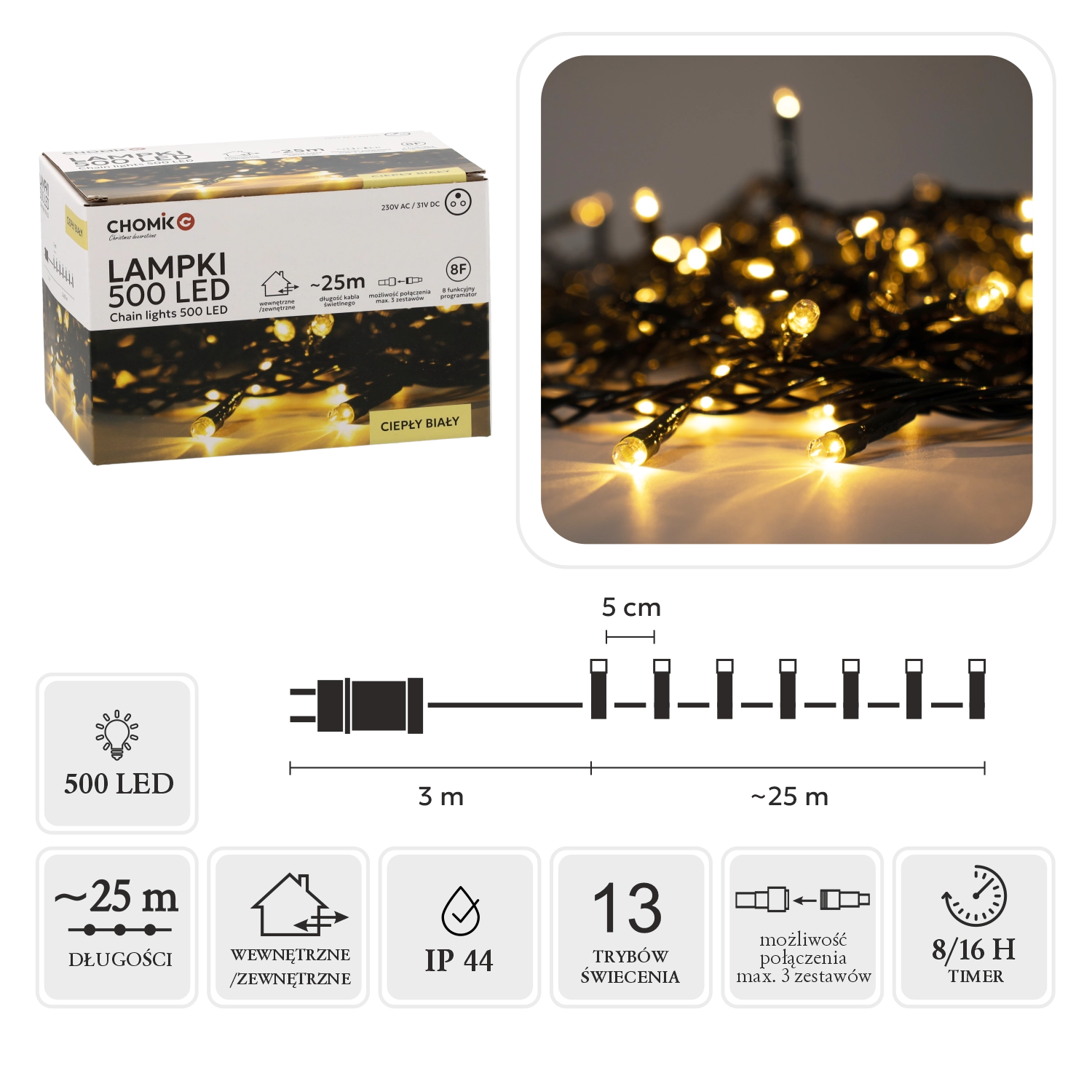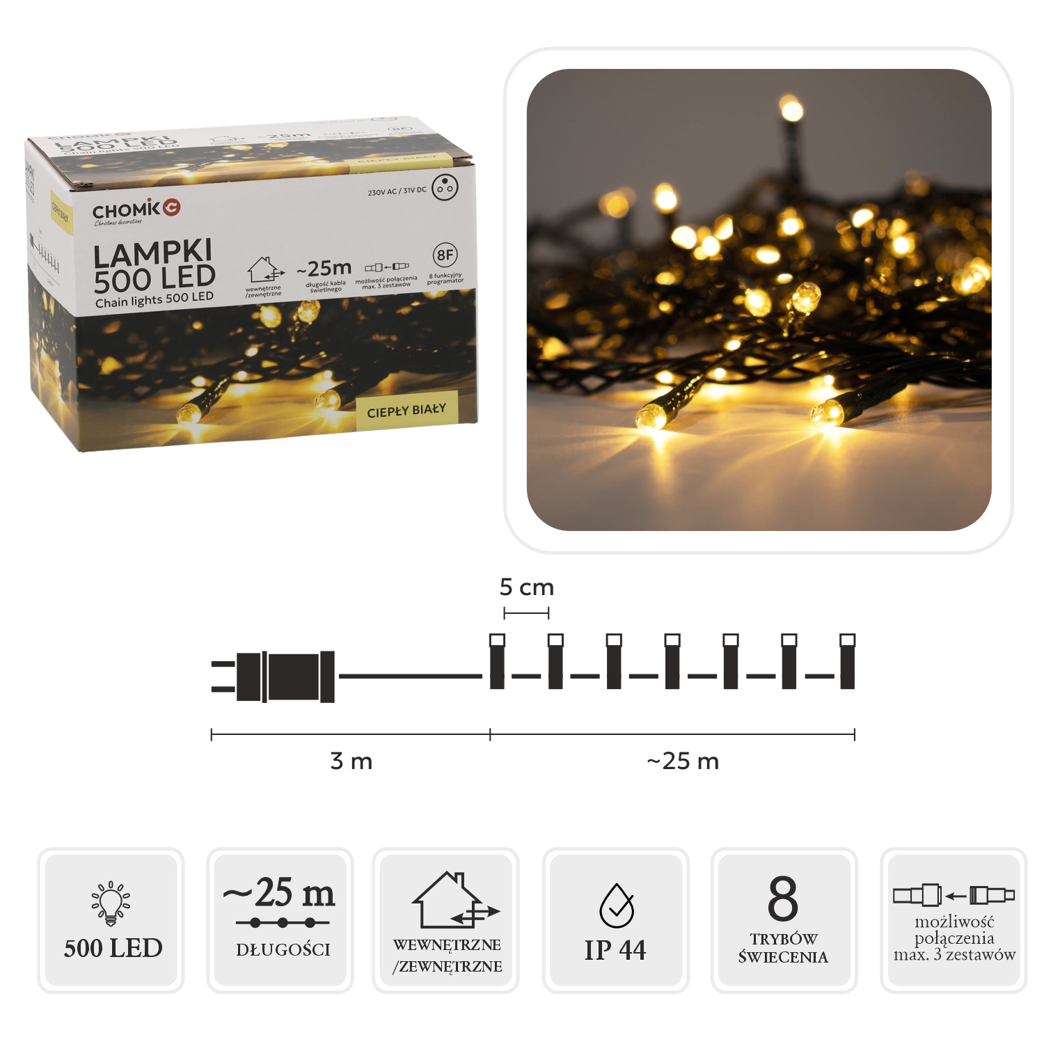 Megbízható és elegáns karácsonyi világítást keresel? Ez a LED fényfüzér 500 diódával, meleg fehér színben meghitt, ünnepi hangulatot kölcsönöz a térnek. A 25 m hosszú világító résznek és az 5 cm-es LED-távolságnak köszönhetően egyenletesen díszíti a fát, a homlokzatot vagy a korlátot.