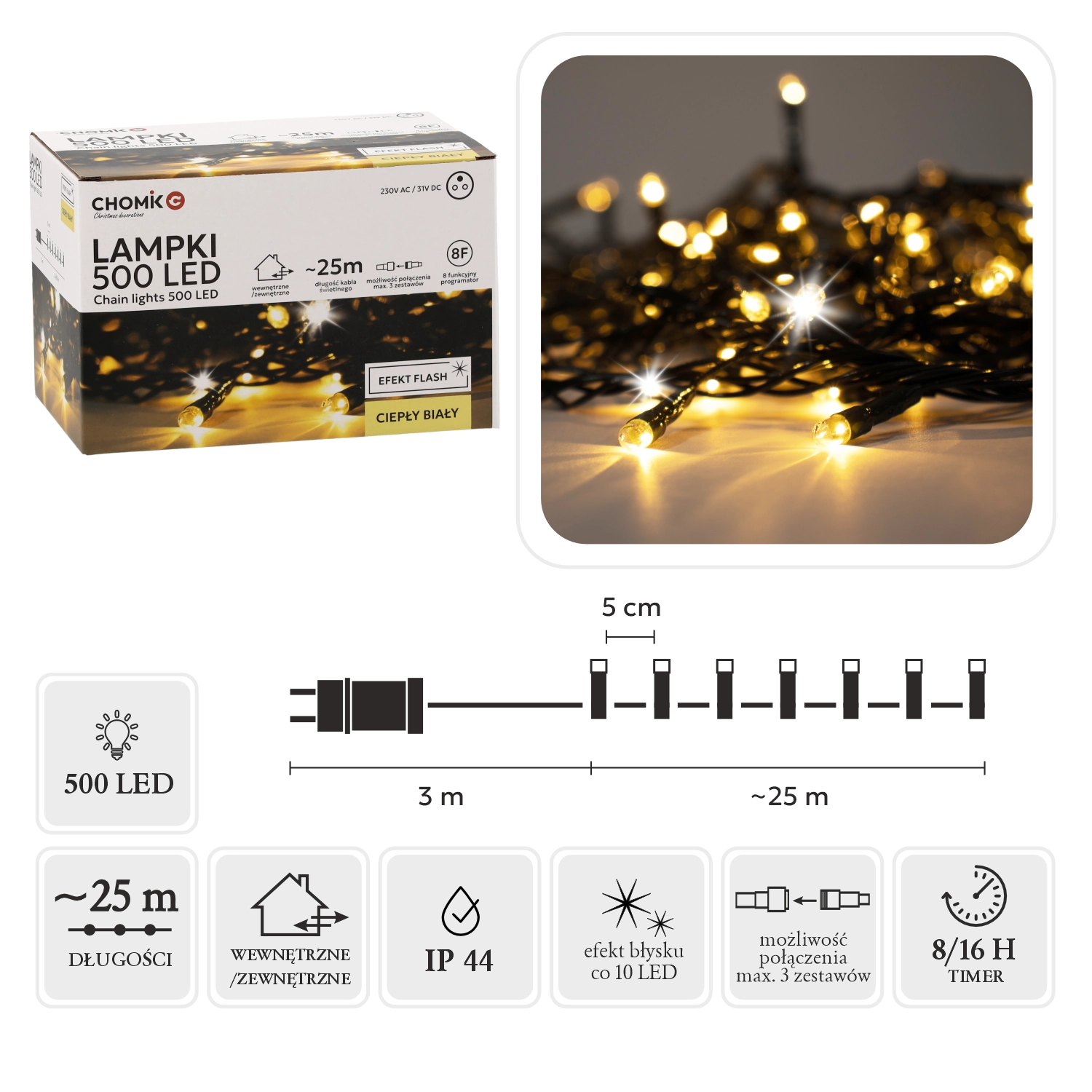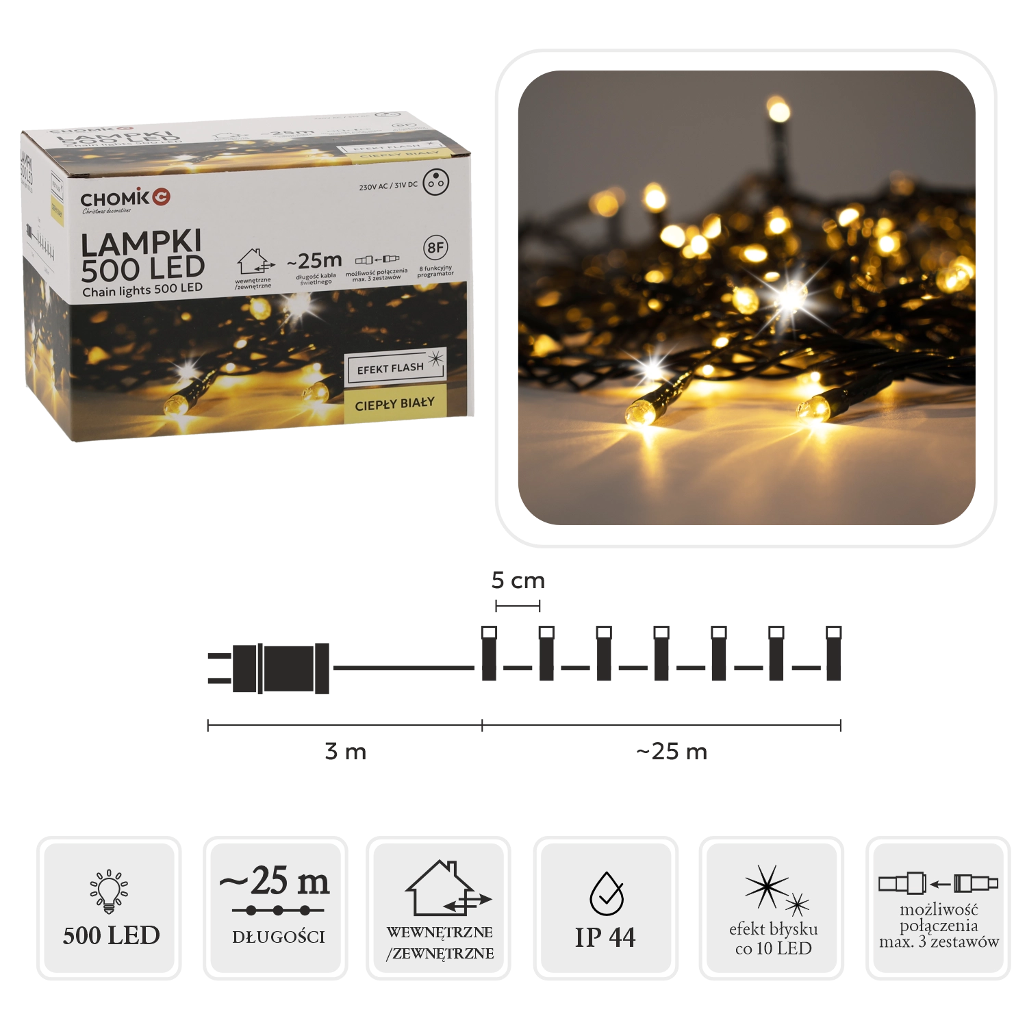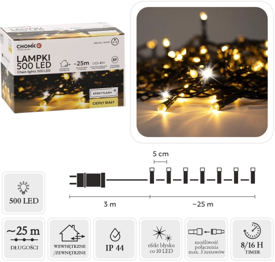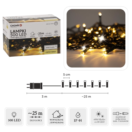 Világítsa meg otthonát és kertjét a 28 méteres, 500 LED-es fényfüzérrel, amely meleg fehér fénnyel ragyog és látványos hideg „flash” villanást ad. A IP44 védelemnek, a memóriás programozónak és 8/16 órás időzítőnek, valamint akár 3 füzér összekapcsolhatóságának köszönhetően a telepítés egyszerű, az eredmény pedig lenyűgöző.