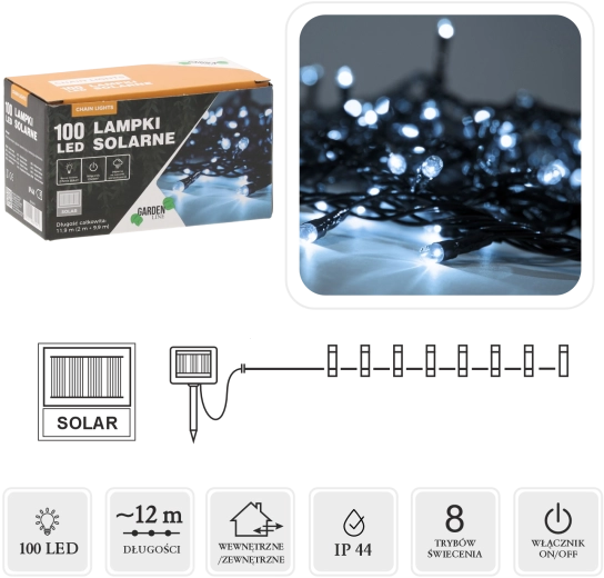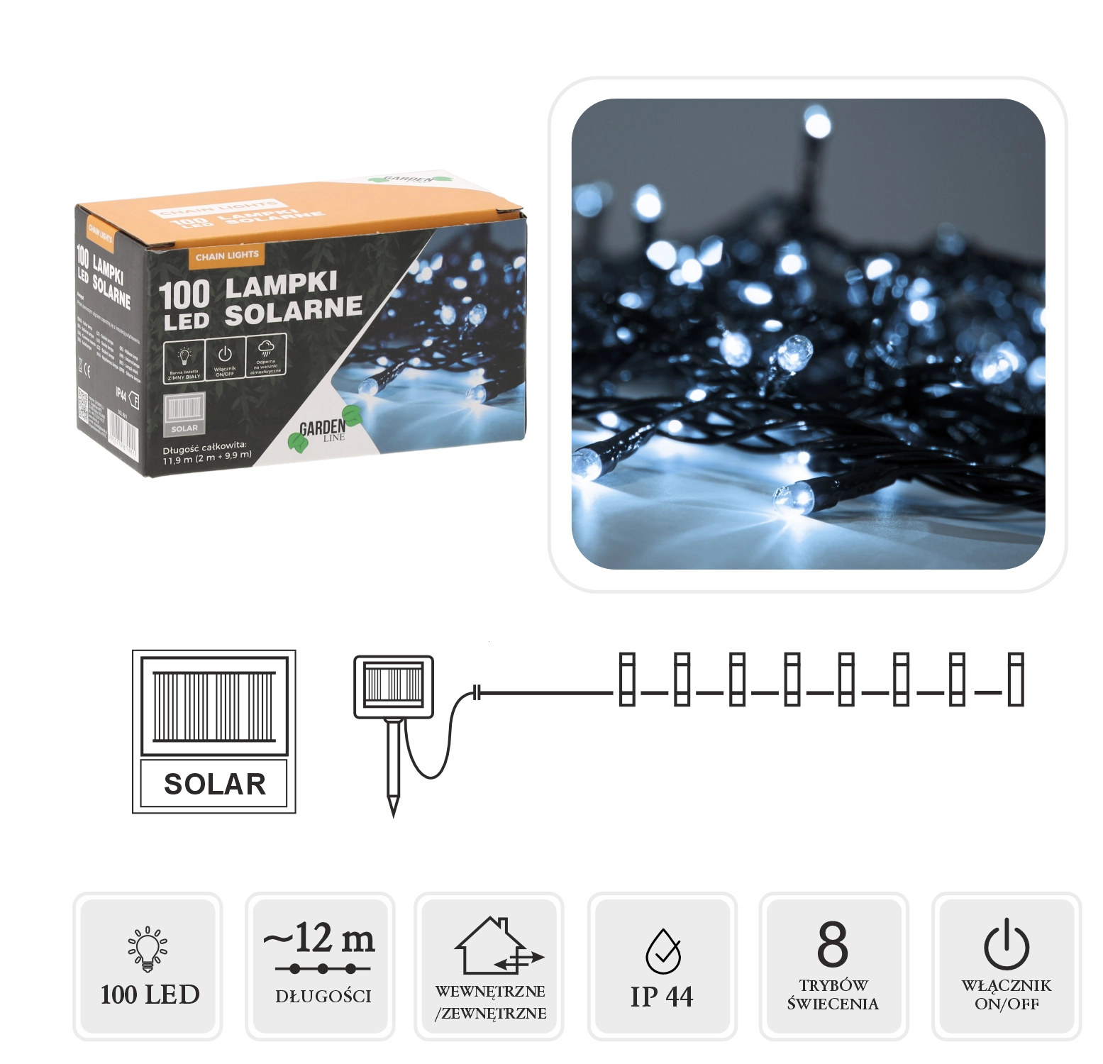 Napelemes LED fényfüzér 100 hideg fehér LED-del, hálózati csatlakoztatás nélkül. Világító rész hossza 10 m, betáp 2 m, összesen 12 m. Időzítő/programvezérlés 8 funkcióval, IP44 védelem kültéri használatra és energiatakarékos működés napelemmel. A zöld kábel tökéletesen beleolvad a bokrok, kerítés vagy pergola környezetébe.