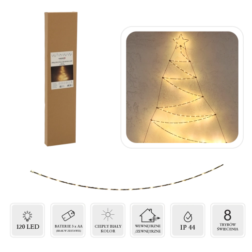 Az ízléses LED fácska fekete színű, fém vázzal azonnal karácsonyi varázst teremt. A 120 finom LED dióda meleg fehér fénye és a díszes csillag a tetején meghitt atmoszférát kölcsönöz bármely enteriőrnek. Az elemes működésnek köszönhetően bárhová elhelyezhető, nincs szükség konnektorra vagy kábelekre.