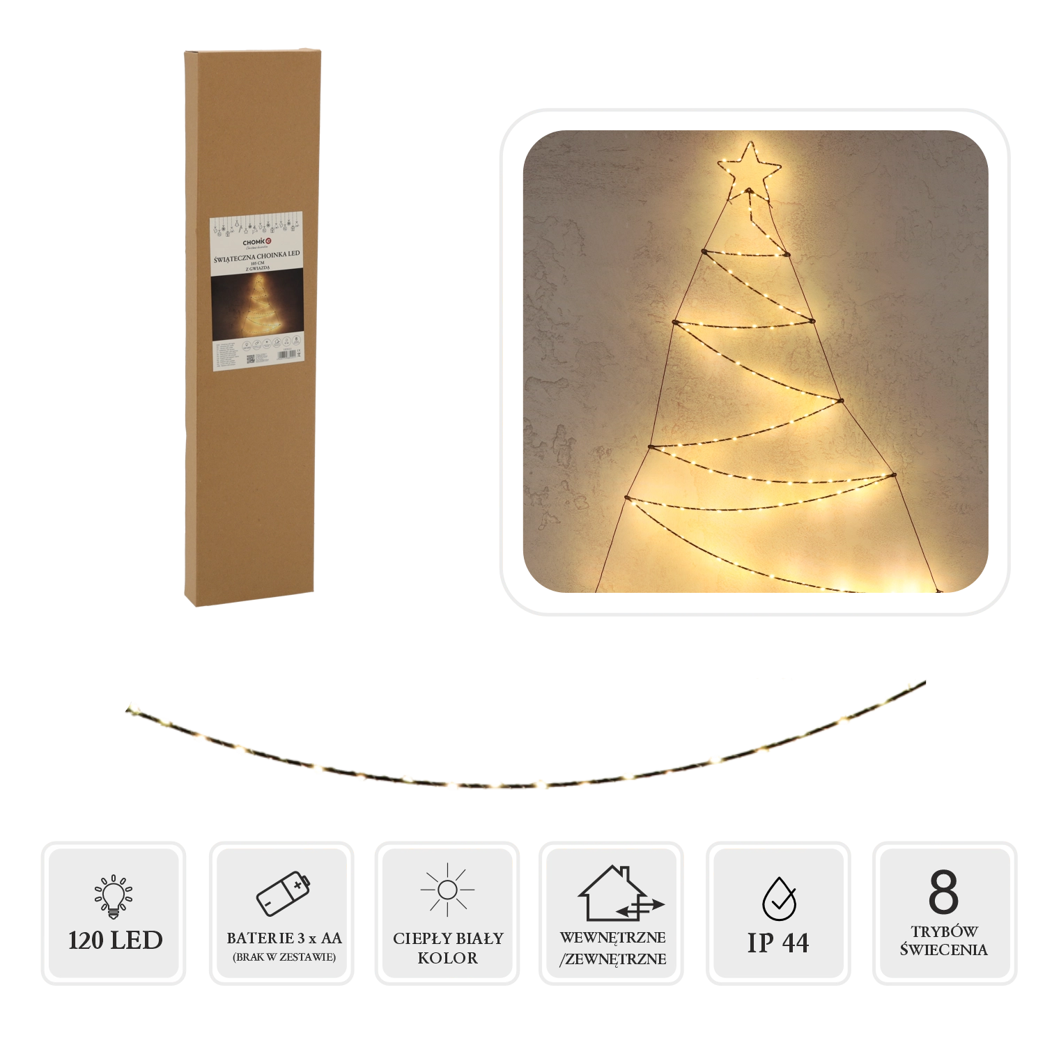 Varázsolj ünnepi hangulatot otthonodba az elegáns, 105 cm magas LED fácskával. 120 LED meleg fehér fényben és a csúcson lévő stílusos csillag teremti meg az otthonos ragyogást a nappaliban vagy a gyerekszobában. A 3× AA elemes táplálásnak köszönhetően kábeltől függetlenül bárhol elhelyezheted, és akár 8 fényfunkció közül választhatsz a tökéletes ünnepi hangulatért.