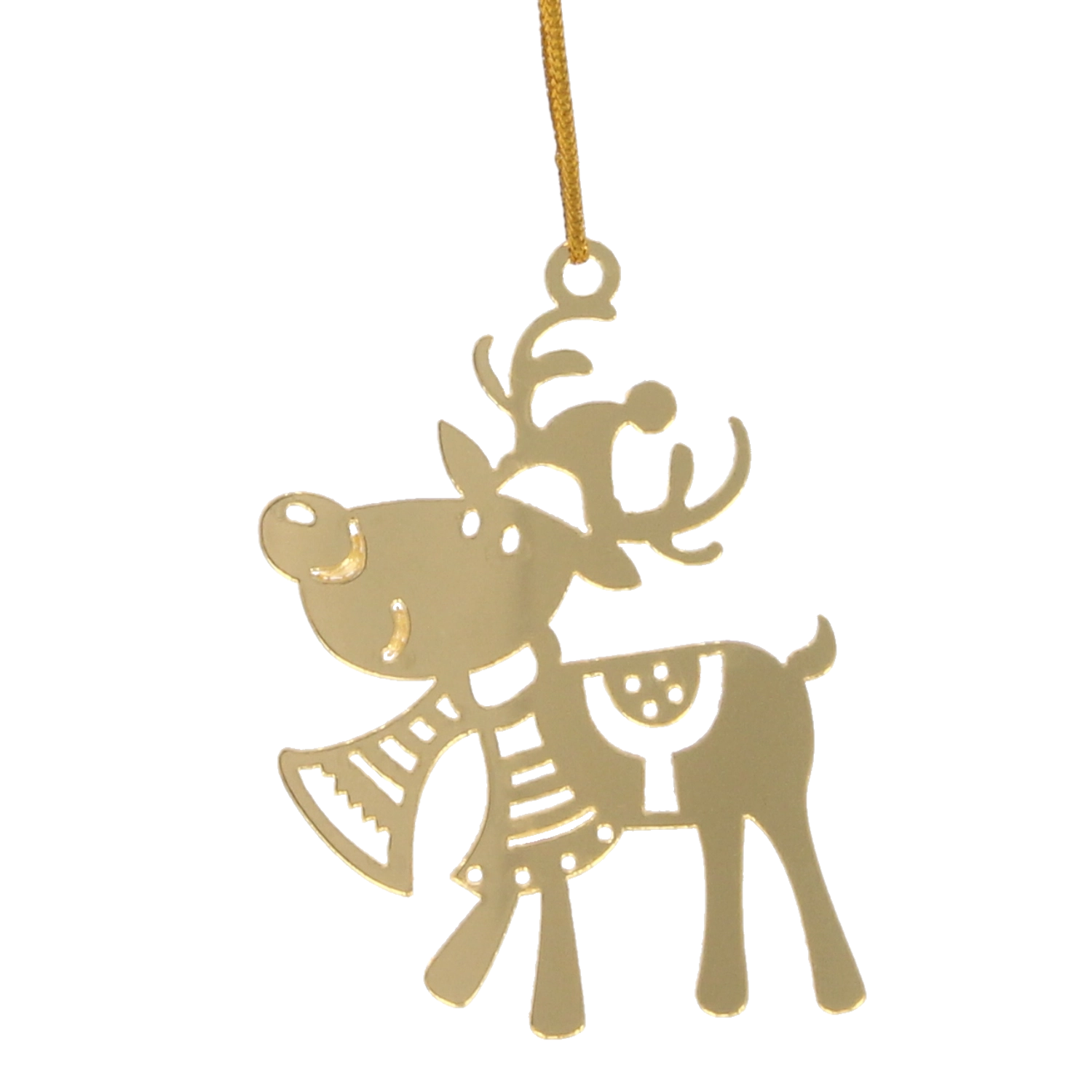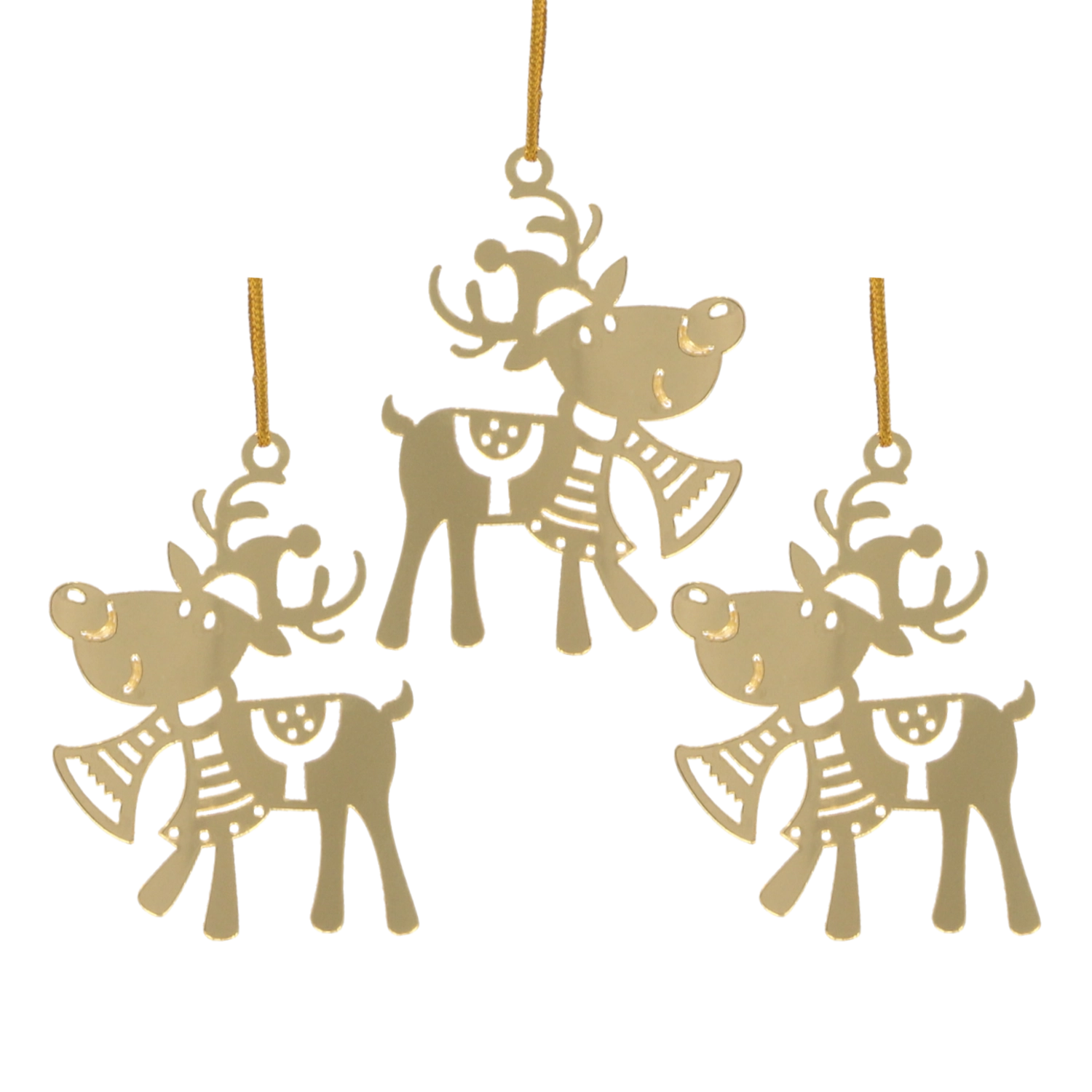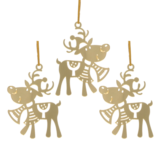 Elegáns, három darabból álló karácsonyi díszkészlet rénszarvas formával, amely díszítésének luxus arany fényt és ünnepi hangulatot kölcsönöz. A könnyű és strapabíró műanyag megkönnyíti a felakasztást anélkül, hogy terhelné az ágakat, a 5,5 × 8 cm kompakt méret pedig ideális a fára, koszorúkra és egyéb dekorációkhoz.