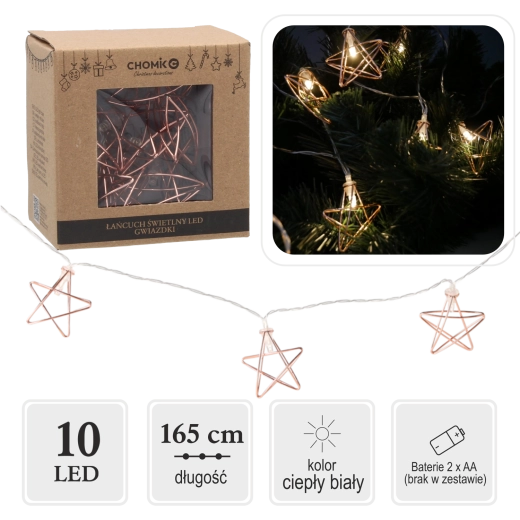 A 2× AA elemes tápellátásnak hála nem vagy konnektorhoz kötve – a füzért könnyedén elrendezheted polcon, ablakon, tükrön vagy asztalon. A teljes hossz 165 cm, a LED-ek közötti 15 cm-es távolság pedig kiegyensúlyozott és látványos megvilágítást biztosít.