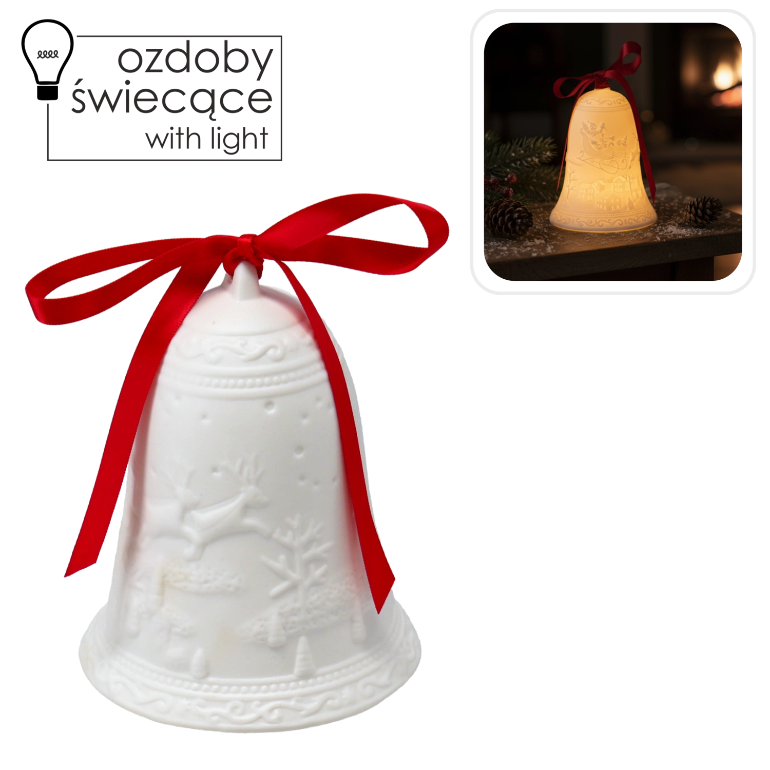 Ez a kerámia karácsonyi csengő a részletgazdag domborításával és meleg LED fényével varázsol meghitt, ünnepi hangulatot az otthonába. A beépített LED világításnak köszönhetően biztonságos és energiatakarékos – ideális a hosszú téli estékhez.