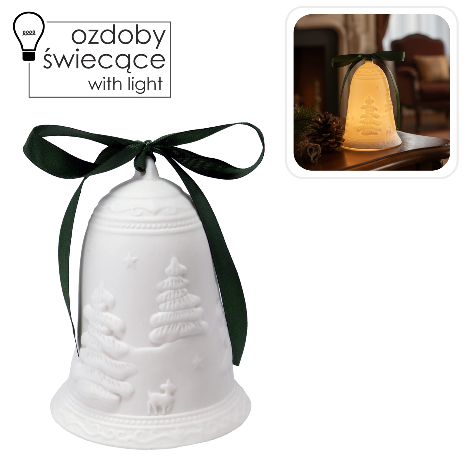 A zöld szalag lehetővé teszi a felakasztást a fára vagy koszorúra, a lapos alj pedig stabil elhelyezést biztosít asztalon, polcon vagy párkányon.