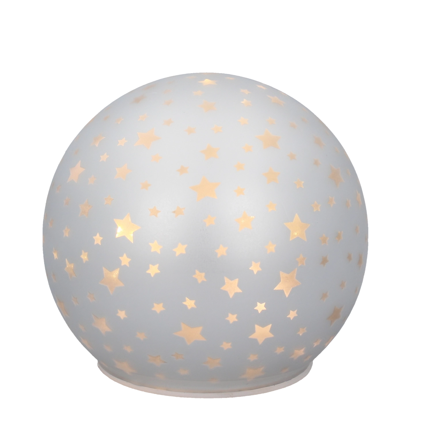 Ez a dekoratív üveggömb csillagmintával stílusos kiegészítő, amely lágy, hangulatvilágítást visz minden szobába. A beépített LED diódák energiatakarékosak, és kellemes vizuális hatást keltenek, amely nagyszerűen illik a nappaliba, hálószobába vagy gyerekszobába.