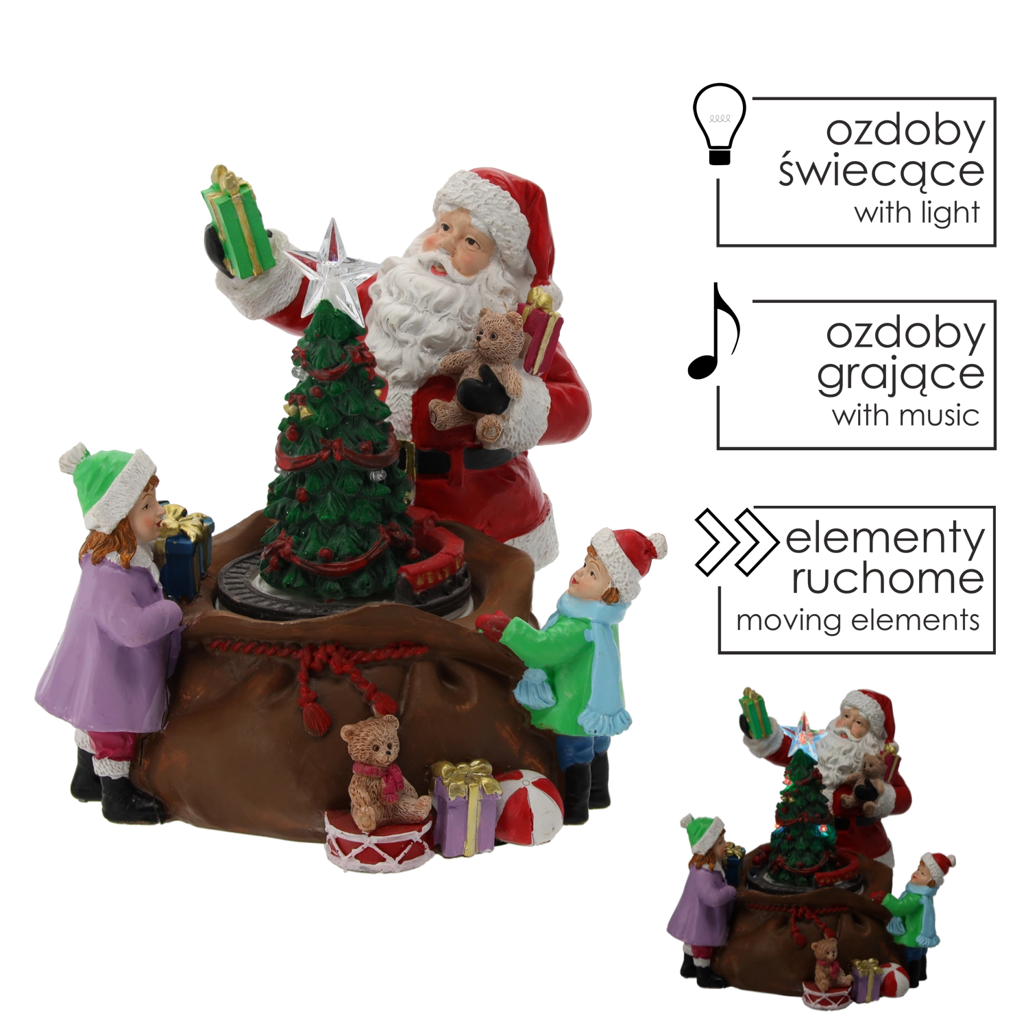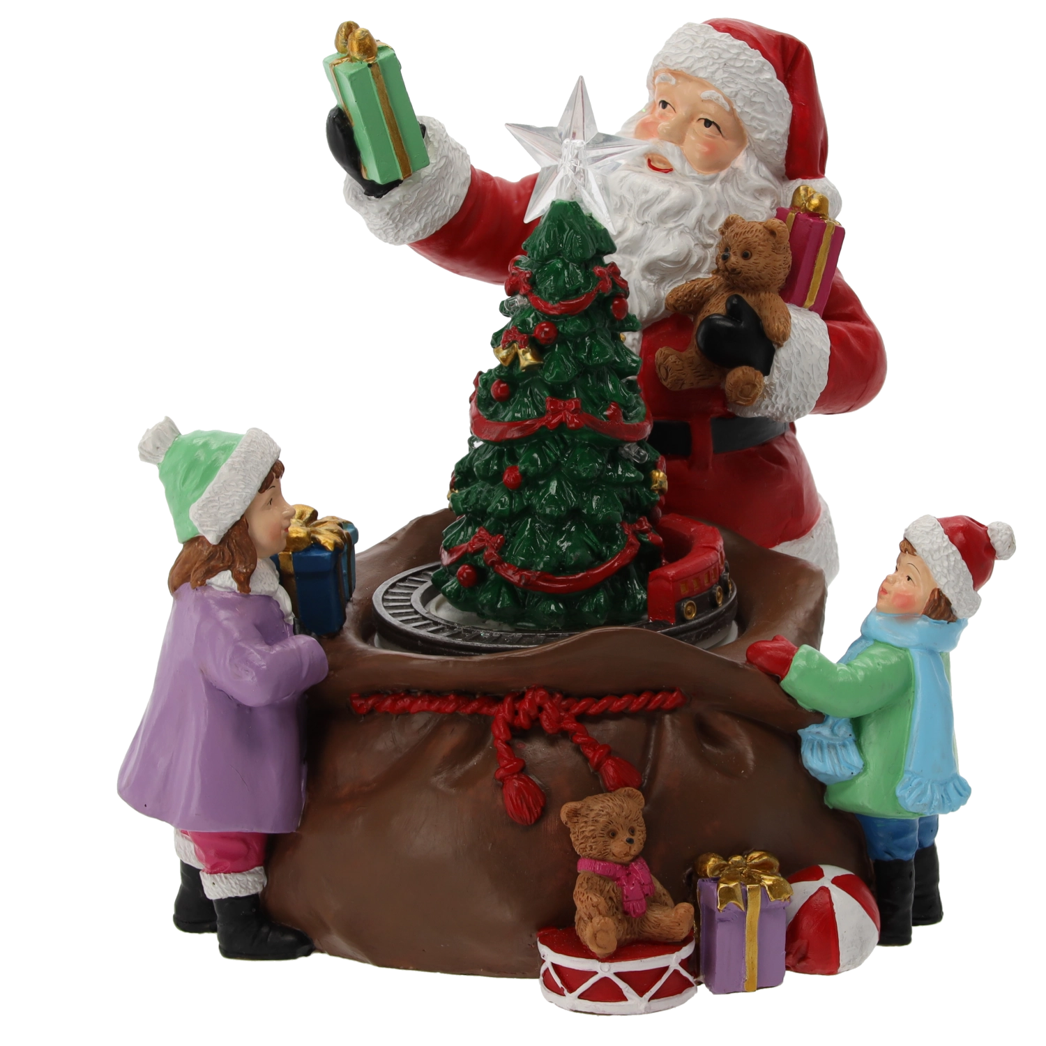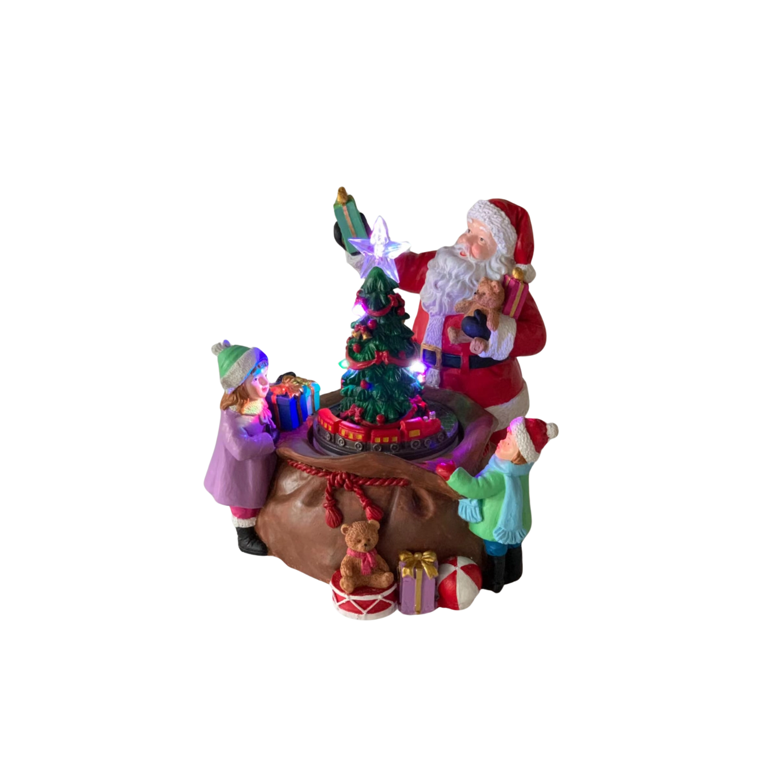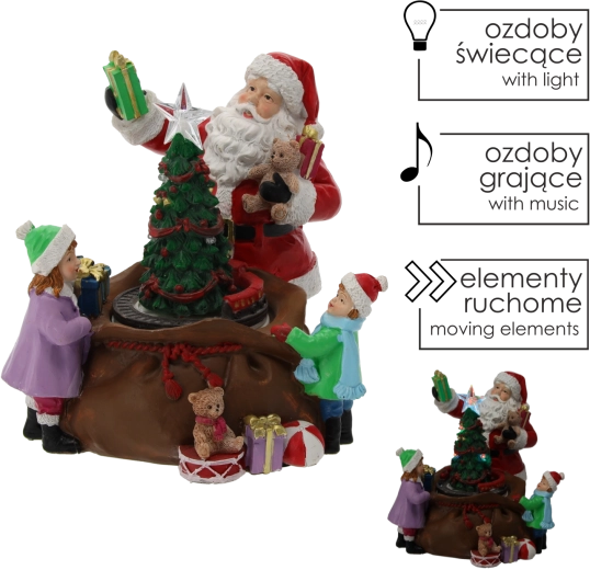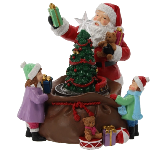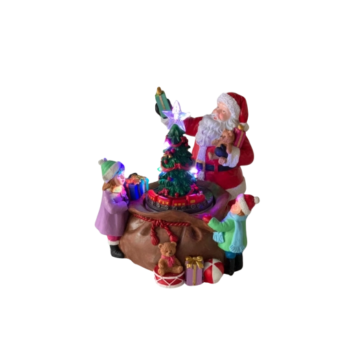 Ez a részletgazdagon kidolgozott karácsonyi dekoráció MIKULÁS figurával, gyerekekkel és bőséges ajándékhalommal a megvilágított fa körül bármely enteriőrt meghitt, ünnepi kuckóvá varázsol. A beépített LED diódák, köztük a fa csúcsán ragyogó csillag és a színes fények, meleg, ünnepélyes légkört teremtenek.