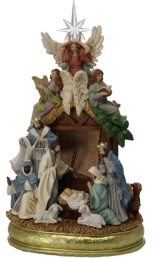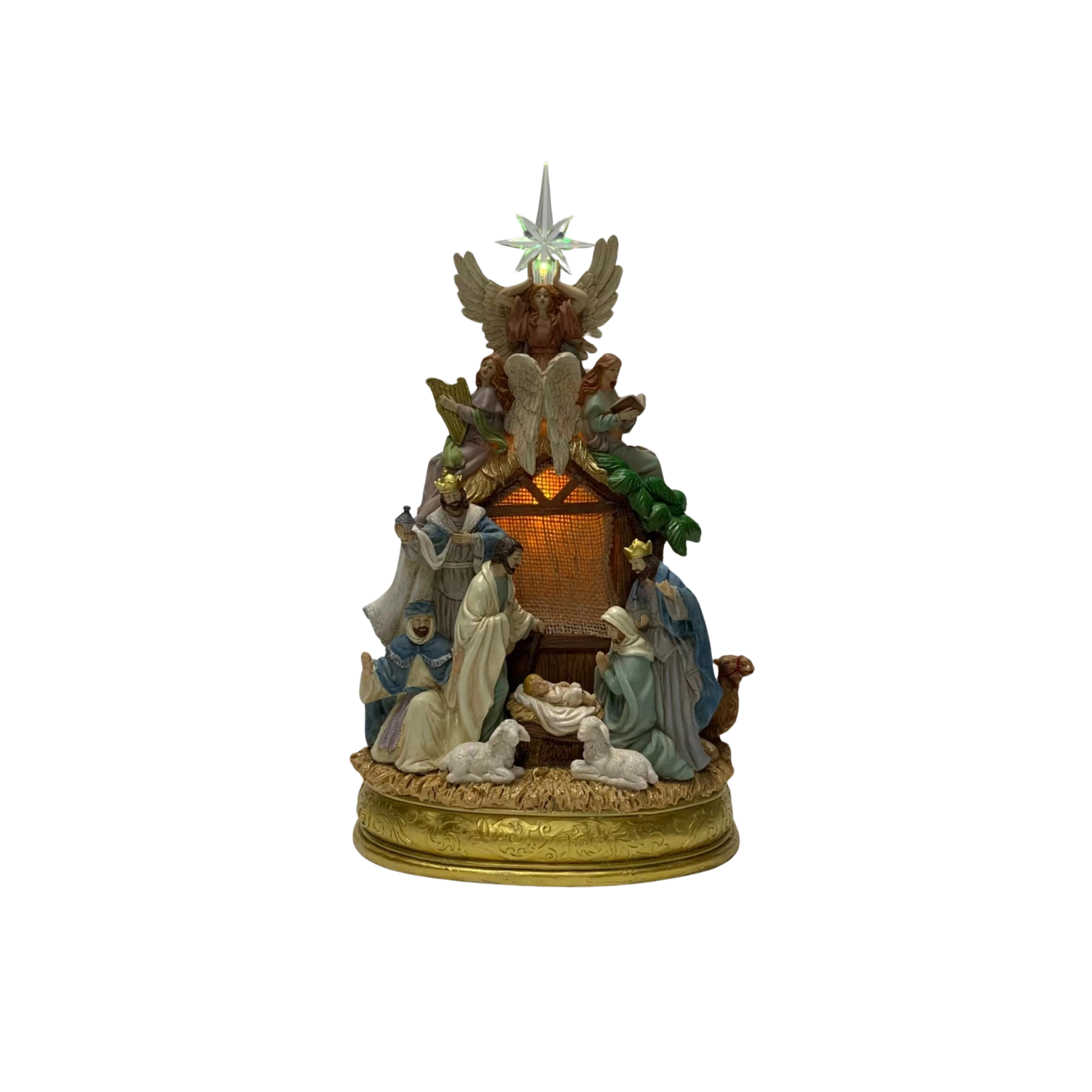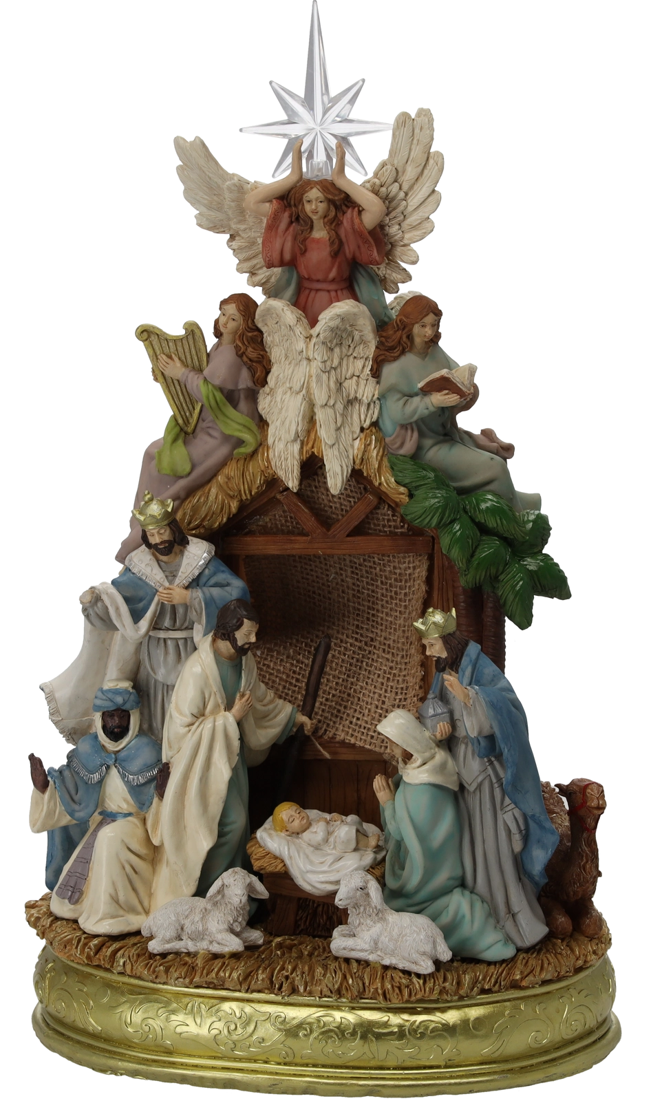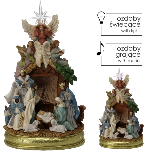 Ez a gyantából készült, dekoratív betlehemi jelenet részletgazdag alakokkal nyűgöz le: a Szent Család, angyalok, pásztorok és a Háromkirályok is helyet kaptak. A beépített LED világítás kellemes, meleg fénnyel ragyogja be az istállót, miközben a betlehemi csillag színesen pulzál, tovább fokozva az ünnepi atmoszférát.