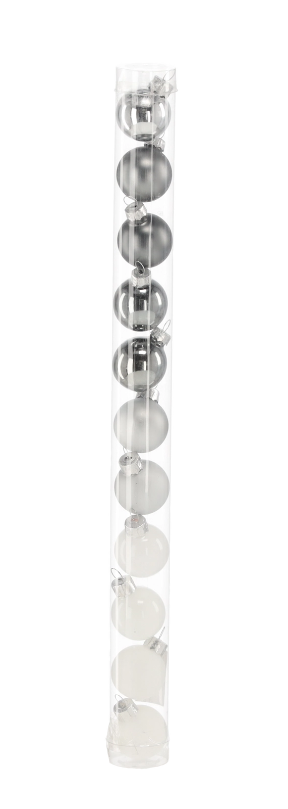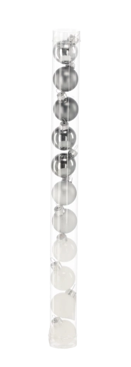 Elegáns, 11 darabos üvegdísz-készlet 3 cm átmérővel, fehér és ezüst kombinációban, amely modern, kifinomult megjelenést kölcsönöz a fának. A fényes, matt és átlátszó felületek keveréke szépen veri vissza a fényt, és finom ünnepi csillogást teremt. A praktikus tubusos doboz megkönnyíti a tárolást és az ajándékozást.