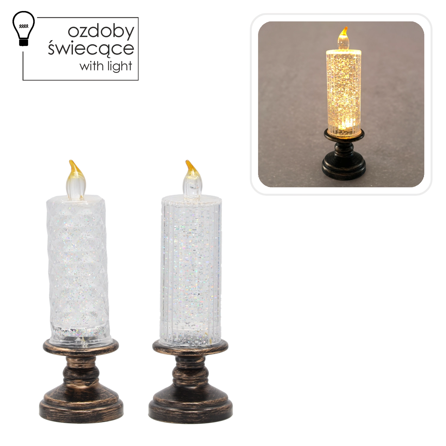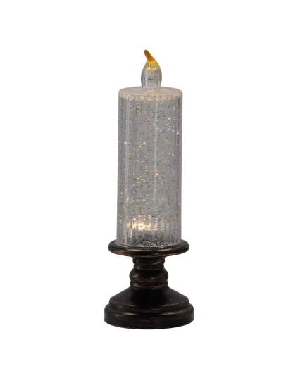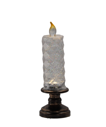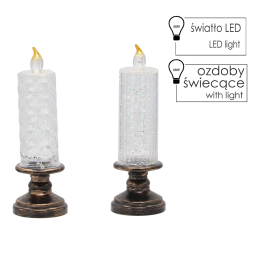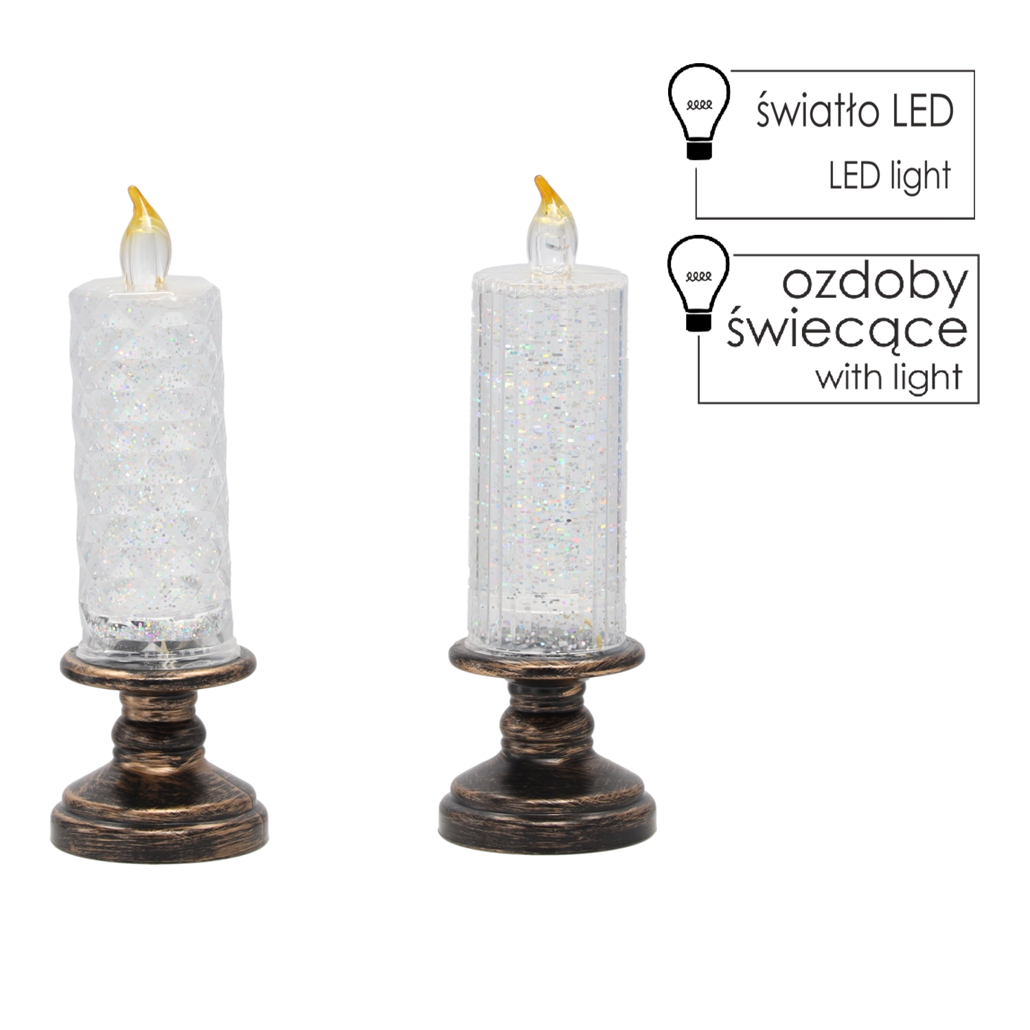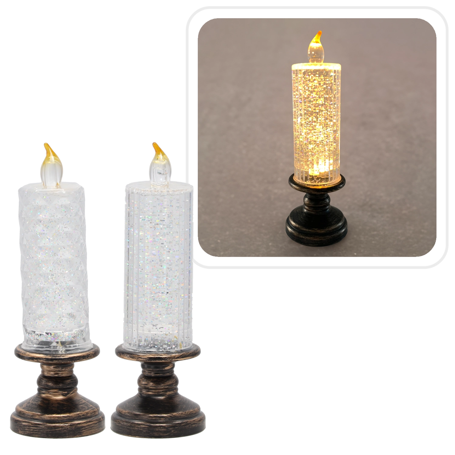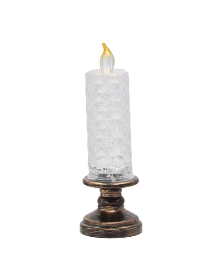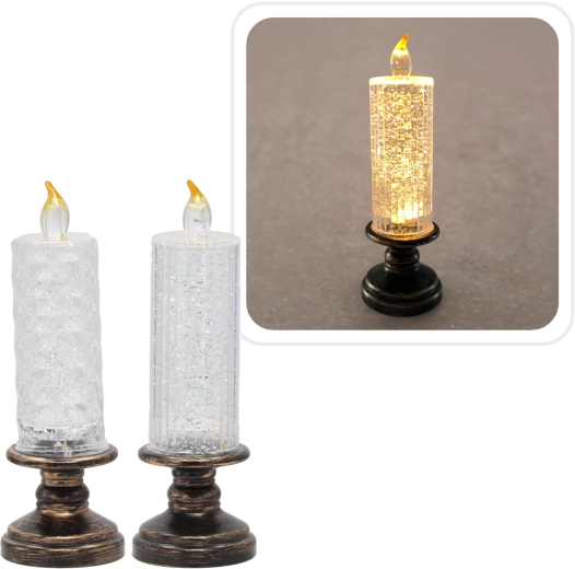 Stílusos dekoratív LED gyertya átlátszó, csillámokkal teli hengerrel és vintage talapzattal, amely egy szempillantás alatt meghitt hangulatot varázsol. Felkapcsolva finom, meleg fényt és ragyogó, csillogó effektust hoz létre, ideális asztalra, komódra vagy ablakpárkányra. A működésről LR44 elemek gondoskodnak, így kábelek nélkül bárhová könnyen elhelyezhető.