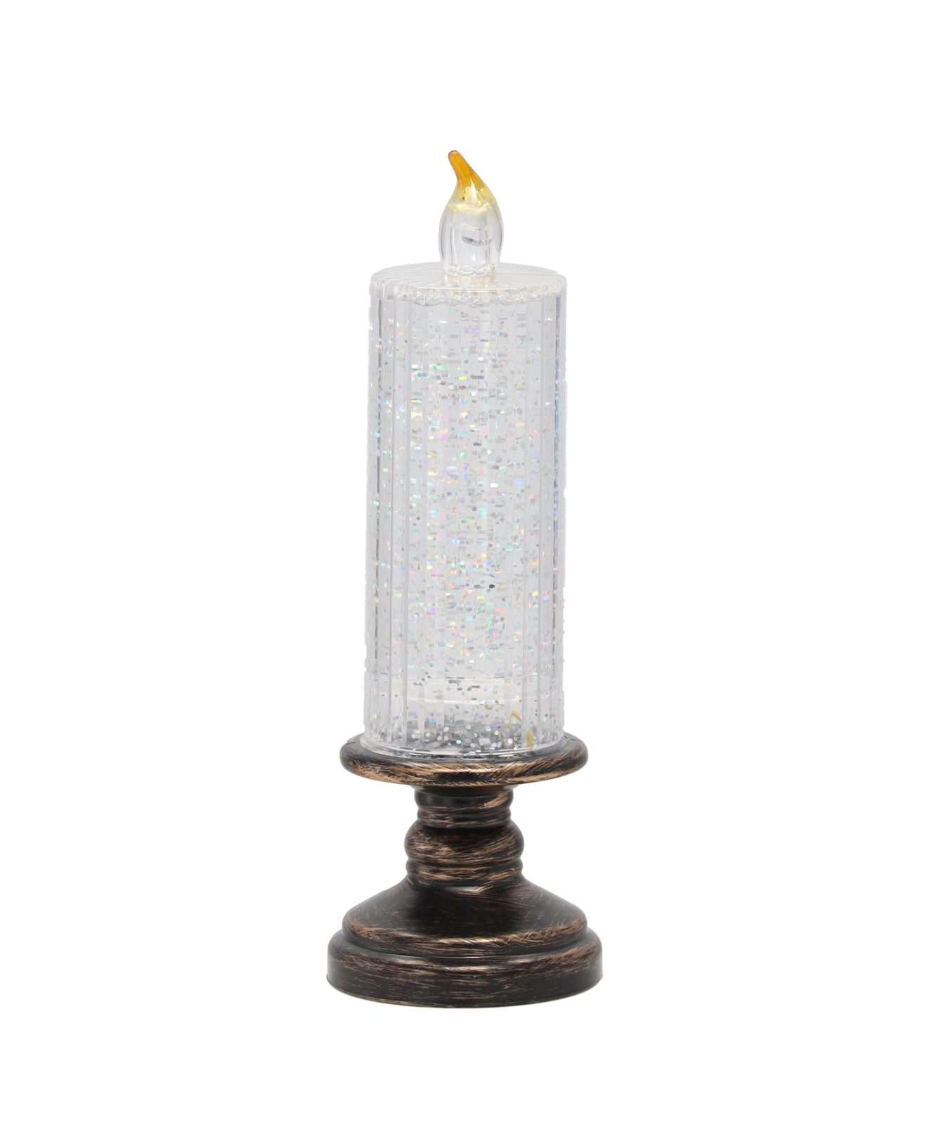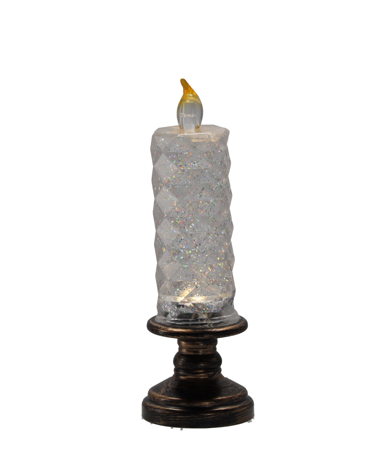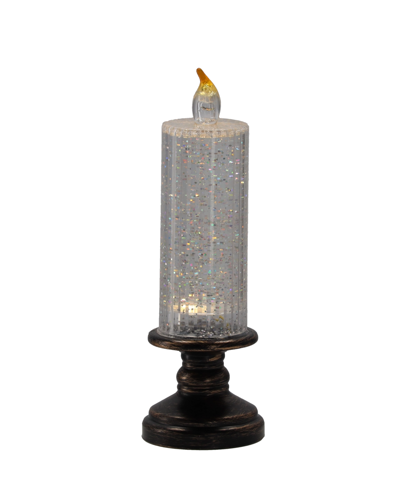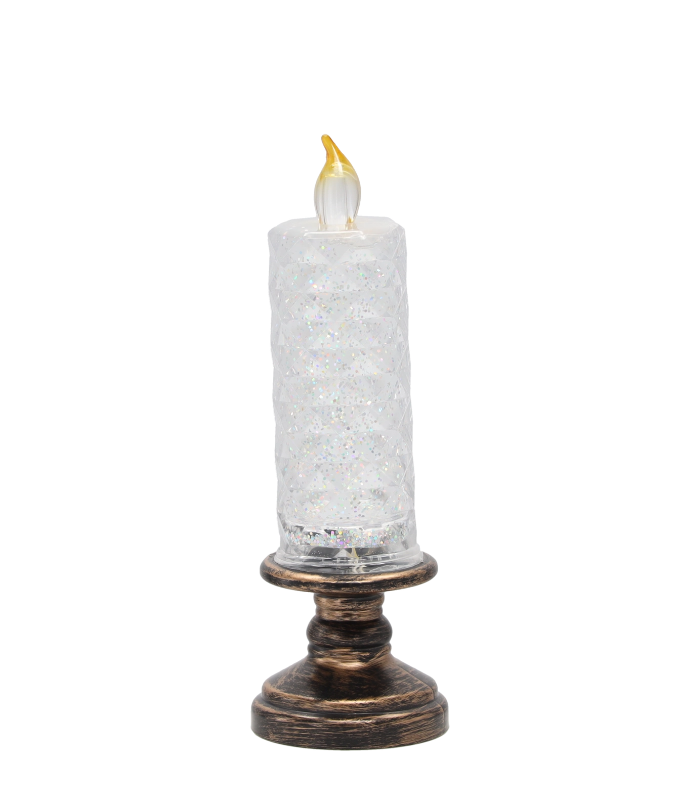 Stílusos dekoratív LED gyertya átlátszó, csillámokkal teli hengerrel és vintage talapzattal, amely egy szempillantás alatt meghitt hangulatot varázsol. Felkapcsolva finom, meleg fényt és ragyogó, csillogó effektust hoz létre, ideális asztalra, komódra vagy ablakpárkányra. A működésről LR44 elemek gondoskodnak, így kábelek nélkül bárhová könnyen elhelyezhető.