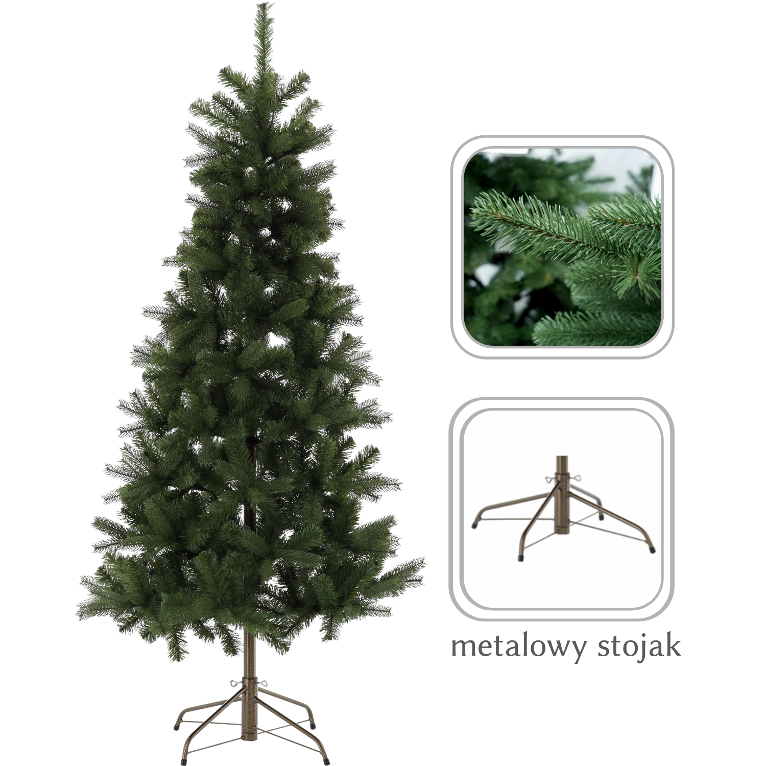 Elegáns, 210 cm magas műkarácsonyfa időtálló dekorációként sűrű PVC ágakkal és stabil fém állvánnyal. Élénkzöld árnyalata természetes hatást kelt, ellenáll a fakulásnak, és könnyű összeszerelést és szétszerelést kínál. Élvezze a valósághű megjelenést, a hosszú élettartamot és a biztonságos stabilitást bőséges díszítés mellett is.