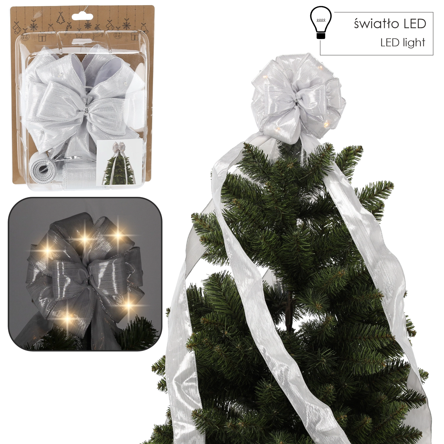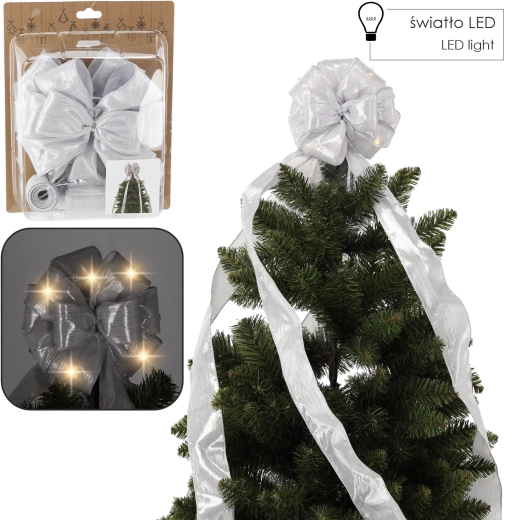 Vigyen finom csillogást és varázslatos hangulatot az ünnepekbe az ezüst színű LED masnival, amely a fa csúcsára kerül. A fényes felület a zöld tűlevelekkel kontrasztban és a finom LED fények kifinomult hatást keltenek, amely kiemeli bármely ünnepi díszítés stílusát.