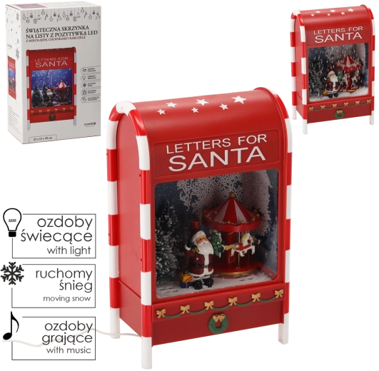 Ez a dekoratív piros postaláda látványos karácsonyi kiegészítő gazdag vizuális és hanghatásokkal. A hideg fehér SMD LED fények kiemelik a téli hangulatot, míg a Mikulással, fenyőfákkal és körhintával díszített jelenet varázslatos mozgó képet teremt. A havazás effektus hiteles ünnepi atmoszférát ad a dekorációnak.