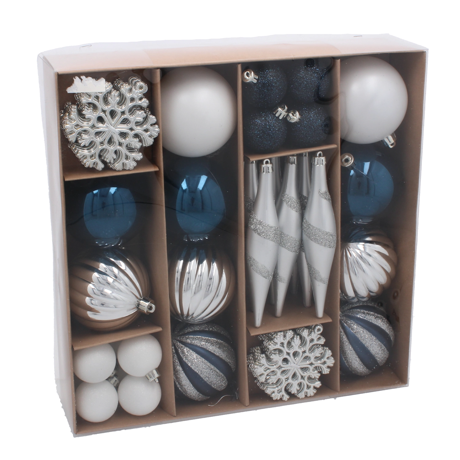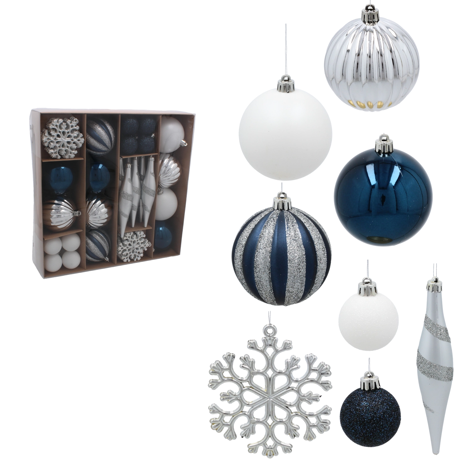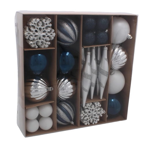 Elegáns 50 darabos karácsonyfadísz-készlet tengerészkék és ezüst árnyalatokban, amely modern lendületet és harmóniát kölcsönöz ünnepi dekorációdnak. A díszek törhetetlen műanyagból készülnek, biztonságosak gyerekek és háziállatok mellett is, és könnyű kialakításuknak köszönhetően egyszerűen felakaszthatók kisebb és nagyobb fákra egyaránt. A változatos formák – a klasszikus gömböktől a tobozokig – lehetővé teszik az egységes, stílusos kompozíció megteremtését. Díszdobozban szállítva, amely ajándéknak is kiváló.