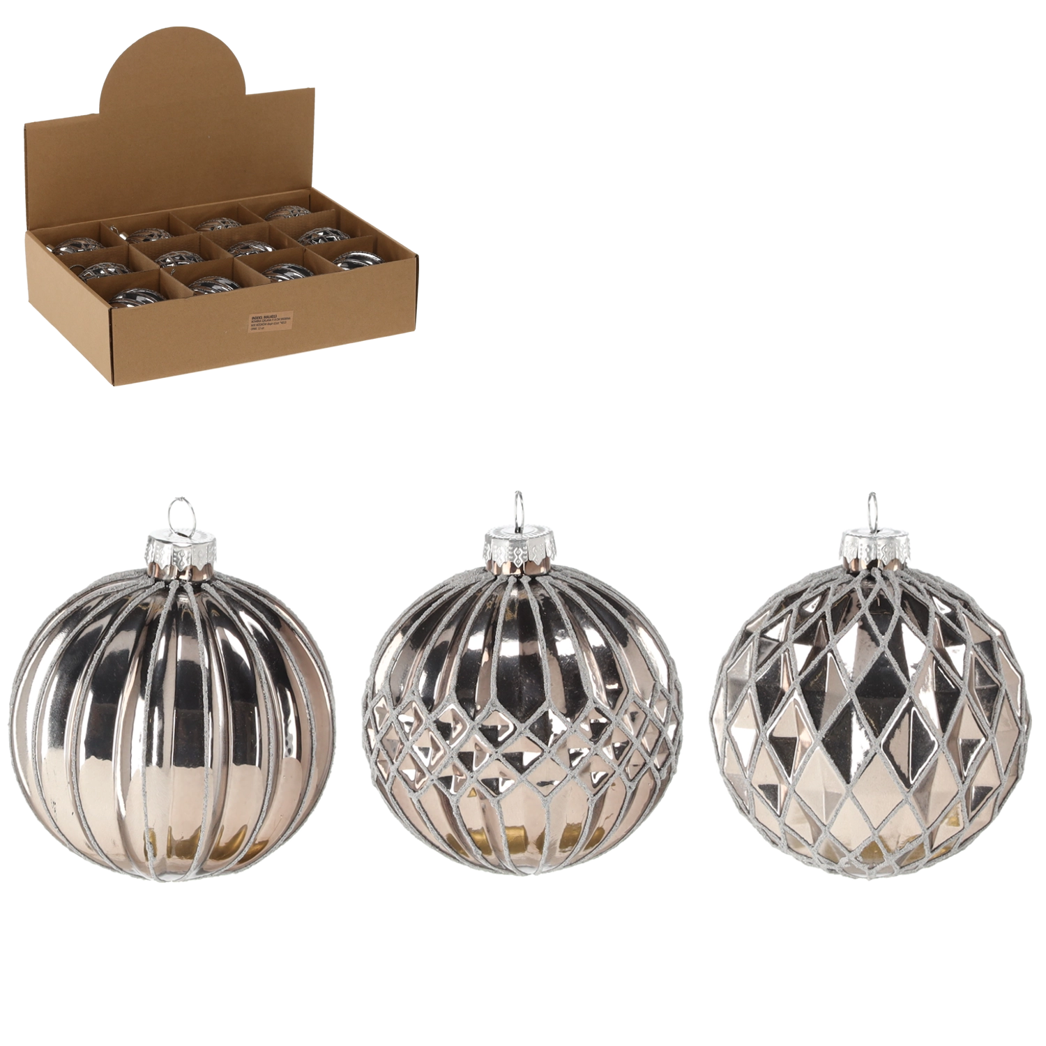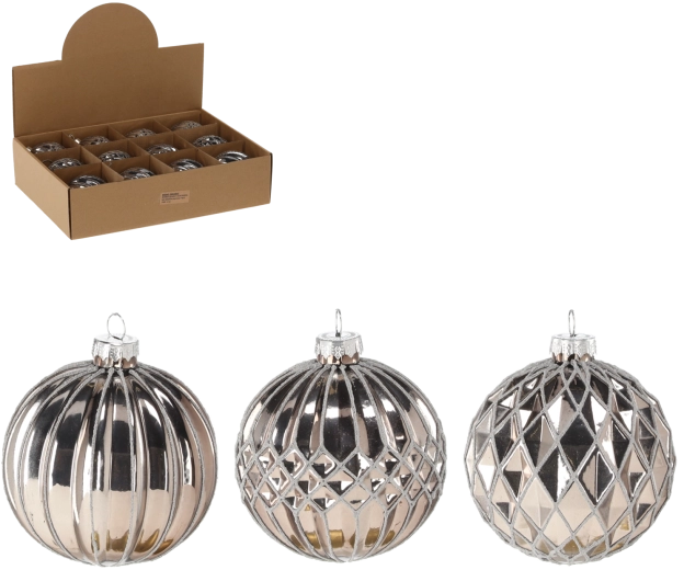 Elegáns, 8 cm átmérőjű üveg karácsonyi gömb ezüst kivitelben, különböző mintákkal, amely stílust és csillogást kölcsönöz a fának. A hagyományos üveg és a modern dizájn kombinációja friss, ünnepi hangulatot teremt, és könnyen párosítható más dekorációkkal.