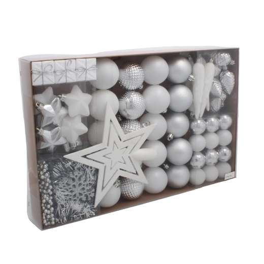 Ez az univerzális, fehér és ezüst színű díszszett kiválóan passzol hagyományos és modern dekorokhoz egyaránt. A felületkeverék – matt, fényes, csillámos és fazettált struktúrák – gyönyörű fényvisszaverődést és vizuális mélységet biztosít. A 60 darabnak köszönhetően könnyedén feldíszítheti az egész fát és a kísérő dekorációkat is.