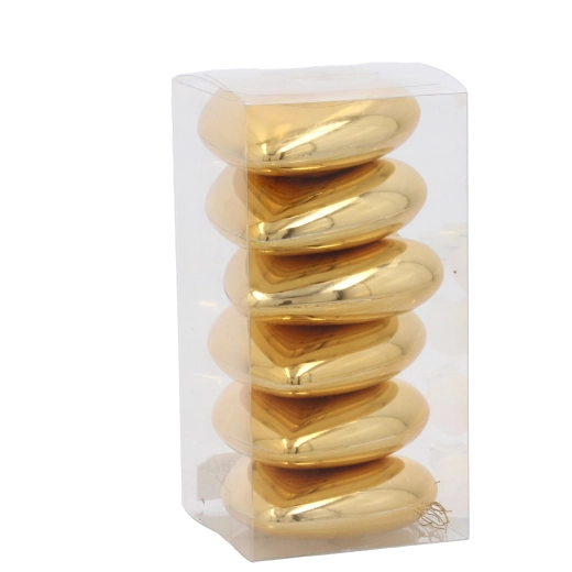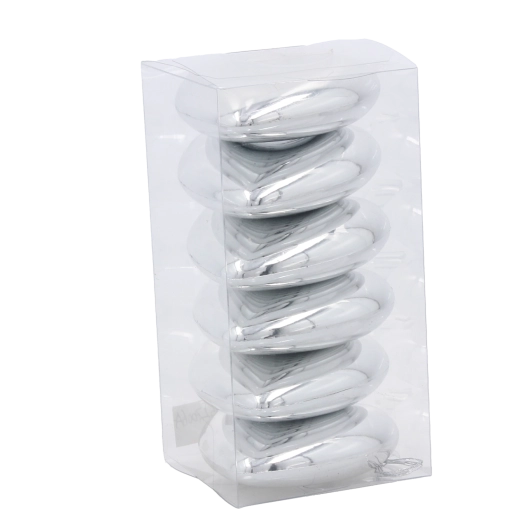 Vigye be otthonába a karácsony varázsát a hat darab, 7 cm átmérőjű szív alakú díszből álló készlettel klasszikus színekben – piros, arany és ezüst. A matt és fényes felület elegáns kombinációja luxus ragyogást kölcsönöz a fának, míg a könnyű és törhetetlen kialakítás biztonságos és kényelmes felakasztást biztosít. A szett átlátszó díszdobozban, szalaggal kerül csomagolásra – ajándéknak is ideális.