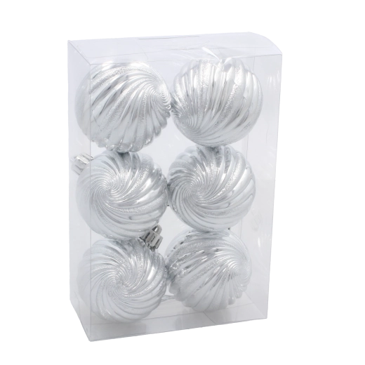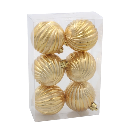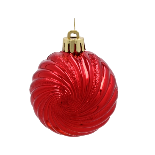 Ez az elegáns karácsonyi gömbszett a hagyományos színeket modern kivitelezéssel ötvözi. A fényes felület spirálos domborítása visszaveri a fényt, varázslatos hangulatot teremtve. A strapabíró, törhetetlen műanyag miatt ideális gyerekekkel és háziállatokkal élő otthonokba.