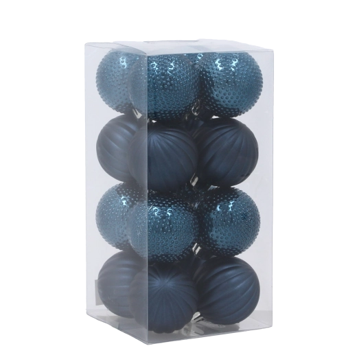 Adj időtlen eleganciát a fádnak a 16 darabos, 4 cm átmérőjű karácsonyi gömbkészlettel, sötétkék és bézs-arany kombinációban. A különböző felületi textúrák – matt bordázás és fényes domborítás – elegáns, harmonikus megjelenést hoznak létre, amely könnyen összehangolható más díszekkel. A könnyű műanyag anyag tartós, és kis- vagy nagyméretű fákhoz egyaránt alkalmas.