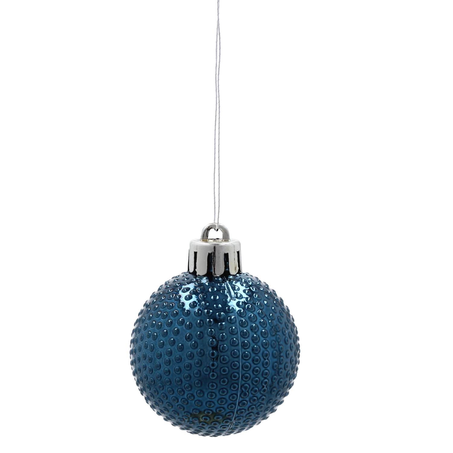 A fényes, texturált sötétkék gömbök szépen visszaverik a fényt, ezáltal kiemelik az ünnepi hangulatot és az elegáns megjelenést.