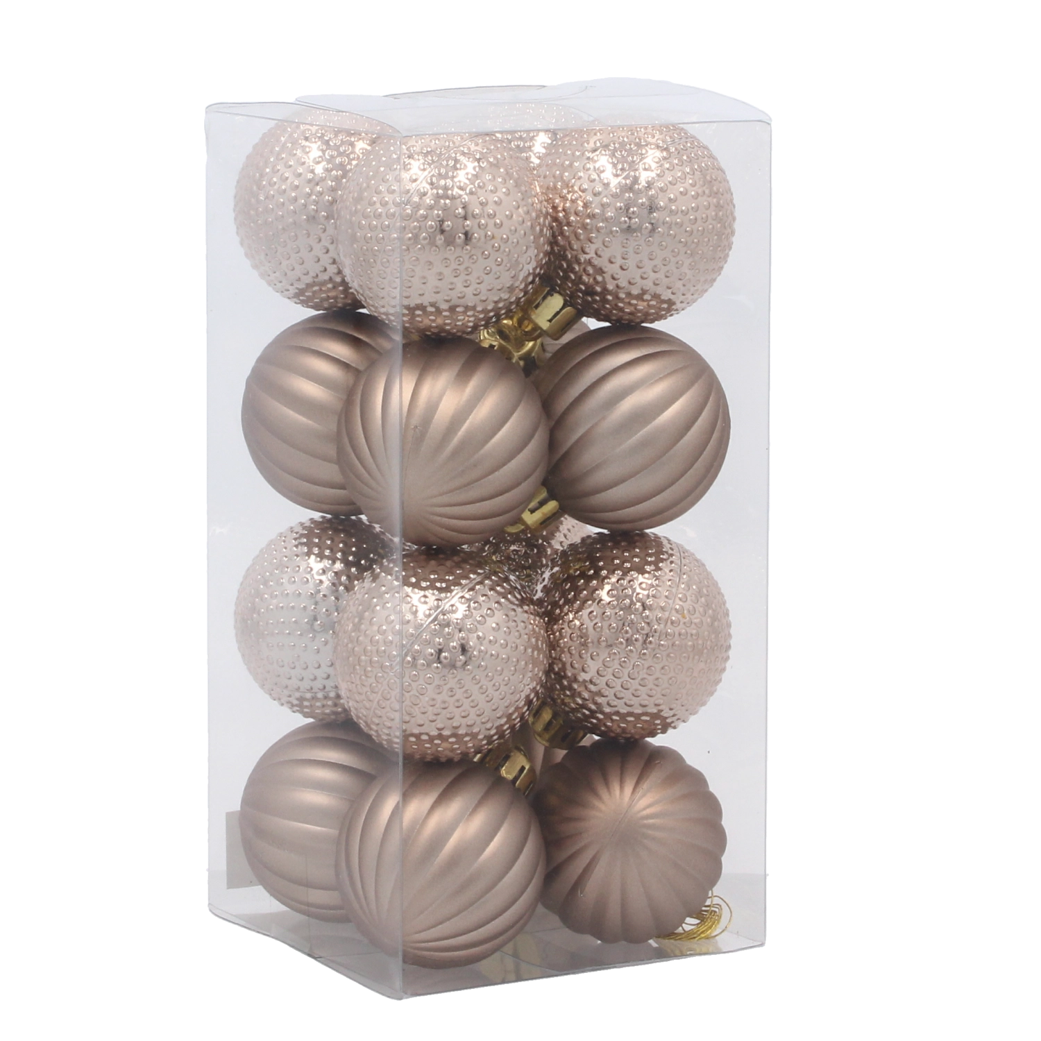 A tartós műanyagnak köszönhetően a gömbök könnyűek és kíméletesek az ágakhoz, ugyanakkor erősek és tartósak a többszöri felhasználáshoz. A 16 darabos készlettel könnyedén alkothatsz kiegyensúlyozott kompozíciót a fán, koszorúkon és ünnepi dekorációkban.