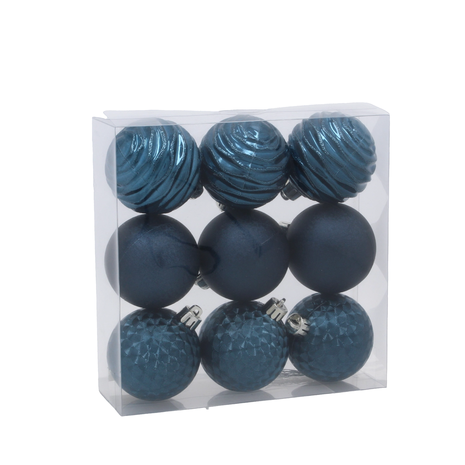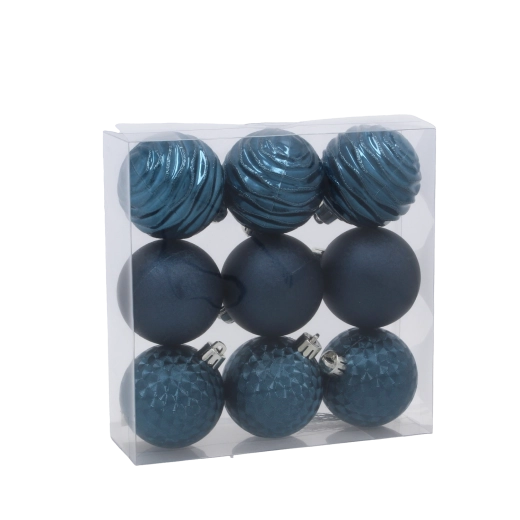 Élvezze az ünnepi hangulatot egy csipetnyi luxussal. A szett kilenc, gondosan megmunkált gömböt tartalmaz a sötétkék és bézs-arany harmonikus kombinációjában. A különféle felületkezelések – a mattól a texturáltig és a fényesig – figyelemfelkeltő kontrasztot hoznak létre a fán, és szépen visszaverik a fényeket.