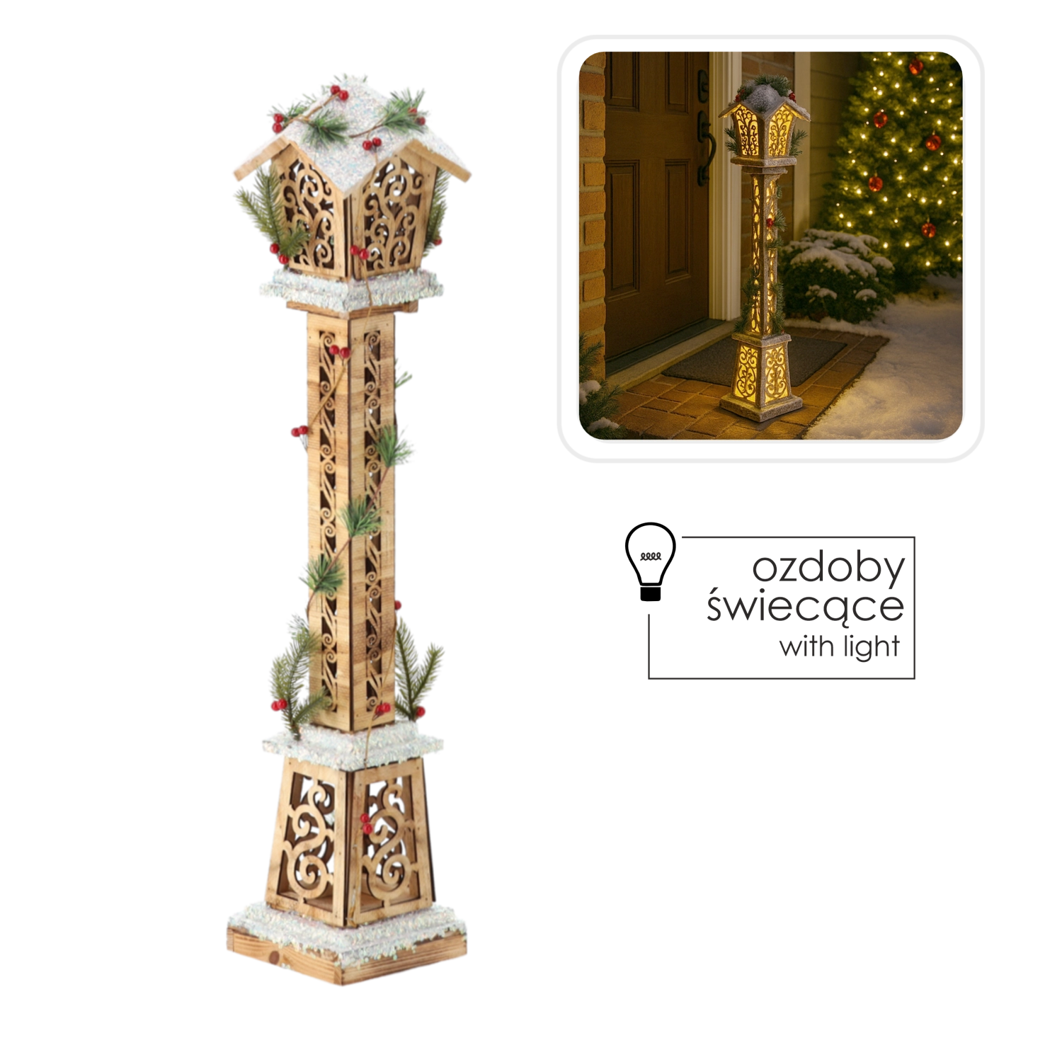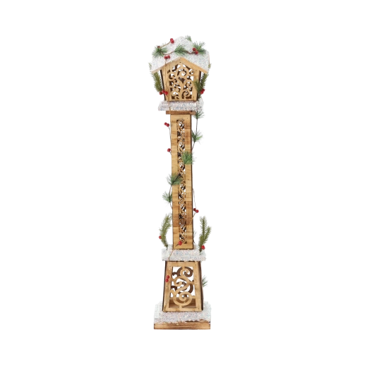 Ez a stílusos lámpás ötvözi a természetes fát, a finom, meleg LED fényt és az ünnepi részleteket, amelyek azonnal különleges hangulatot adnak a térnek. Remekül illik a nappaliba, az előszobába, valamint a fedett teraszra vagy verandára.