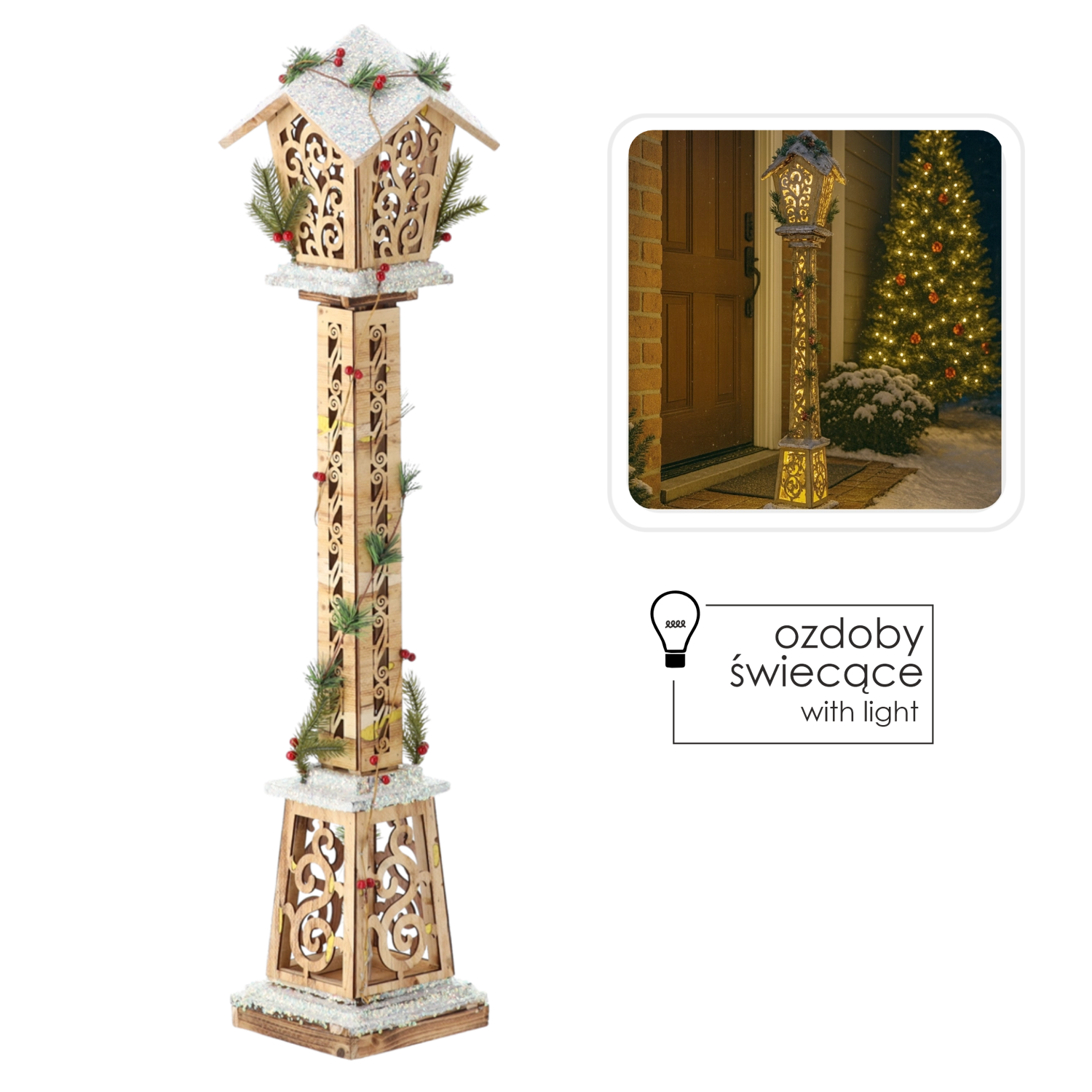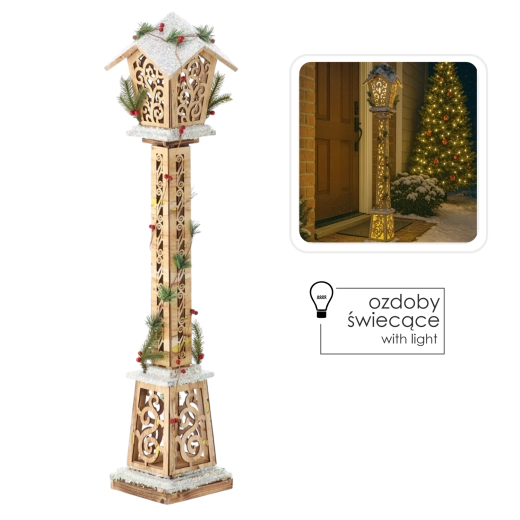 Stílusos, természetes fából készült karácsonyi lámpás meleg fényű LED világítással, amely varázslatos ünnepi hangulatot kölcsönöz otthonának és bejáratának. Az ornamentikus kivágásoknak, a téli akcentusoknak hóval, zölddel és bogyókkal, valamint a tekintélyes, 100 cm-es magasságnak köszönhetően elegáns és otthonos hatást kelt beltérben és fedett teraszon egyaránt.