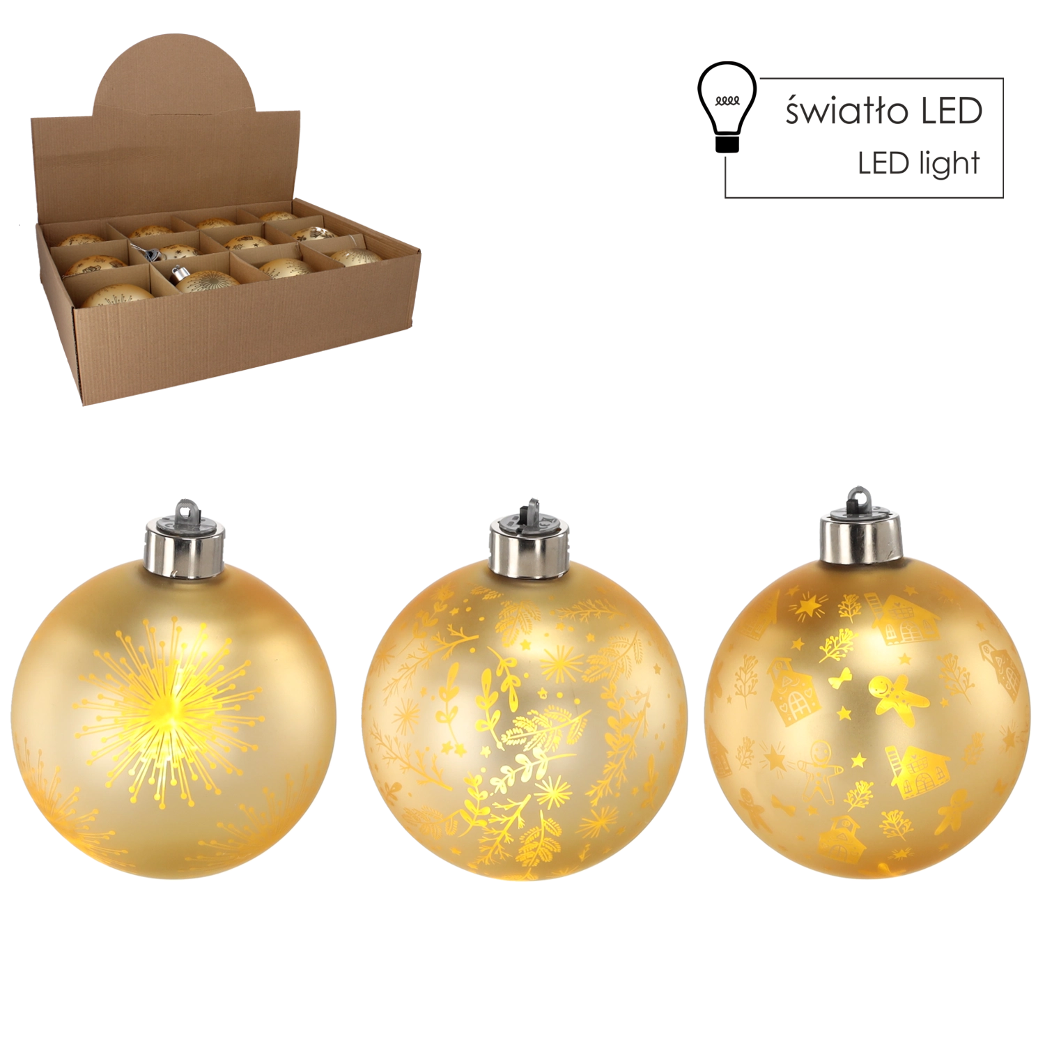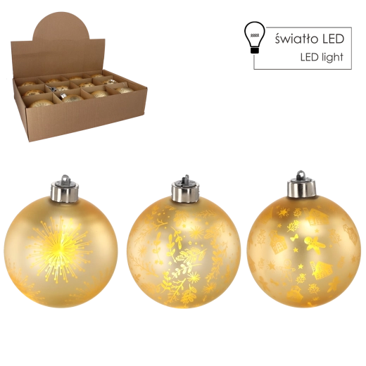 Elegáns arany, üveg karácsonyi gömb 10 cm átmérővel és meleg LED háttérvilágítással, amely varázslatos ünnepi hangulatot teremt az otthonban. A minőségi üveg, a precíz díszítés és az azonnali felakasztás lehetősége a fém akasztónak köszönhetően stílusos dekorációvá teszi a fára és ünnepi kompozíciókba egyaránt.