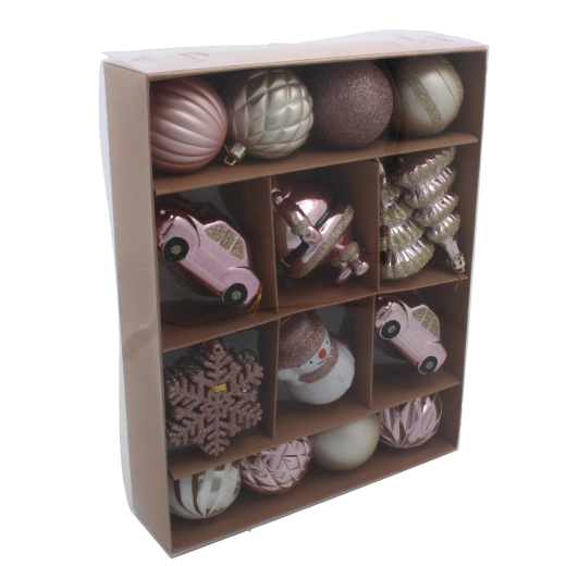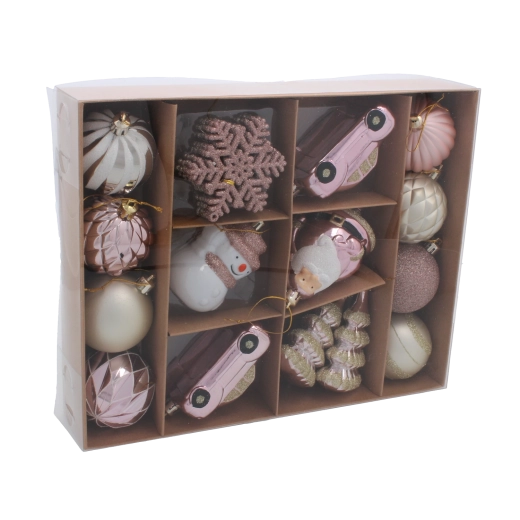 A készlet gondosan válogatott díszeket tartalmaz különböző felületekkel és formákkal, amelyek mélységet és csillogást adnak a fának. A rózsaszín és a kék árnyalatok remekül működnek modern, skandináv és klasszikus enteriőrökben, és könnyen kombinálhatók más dekorációkkal.