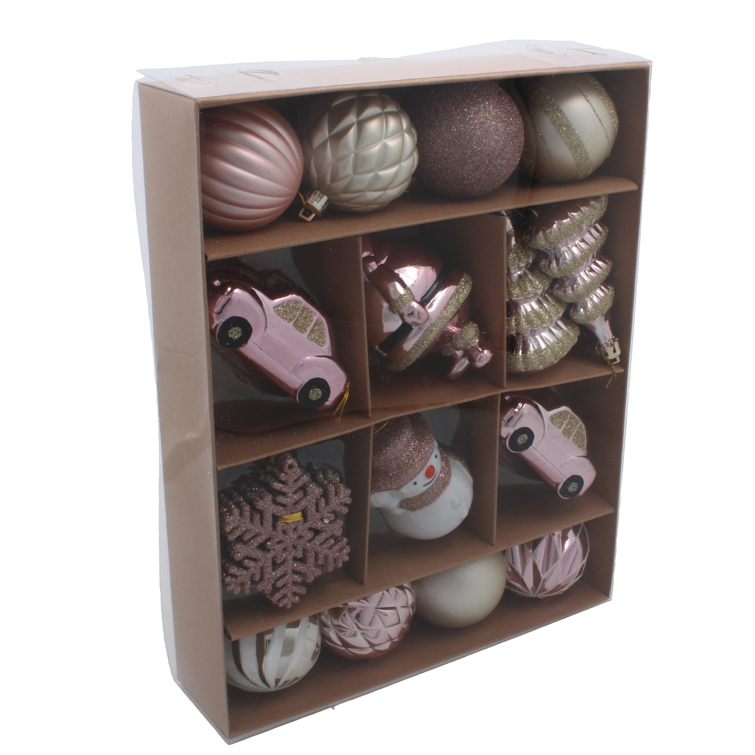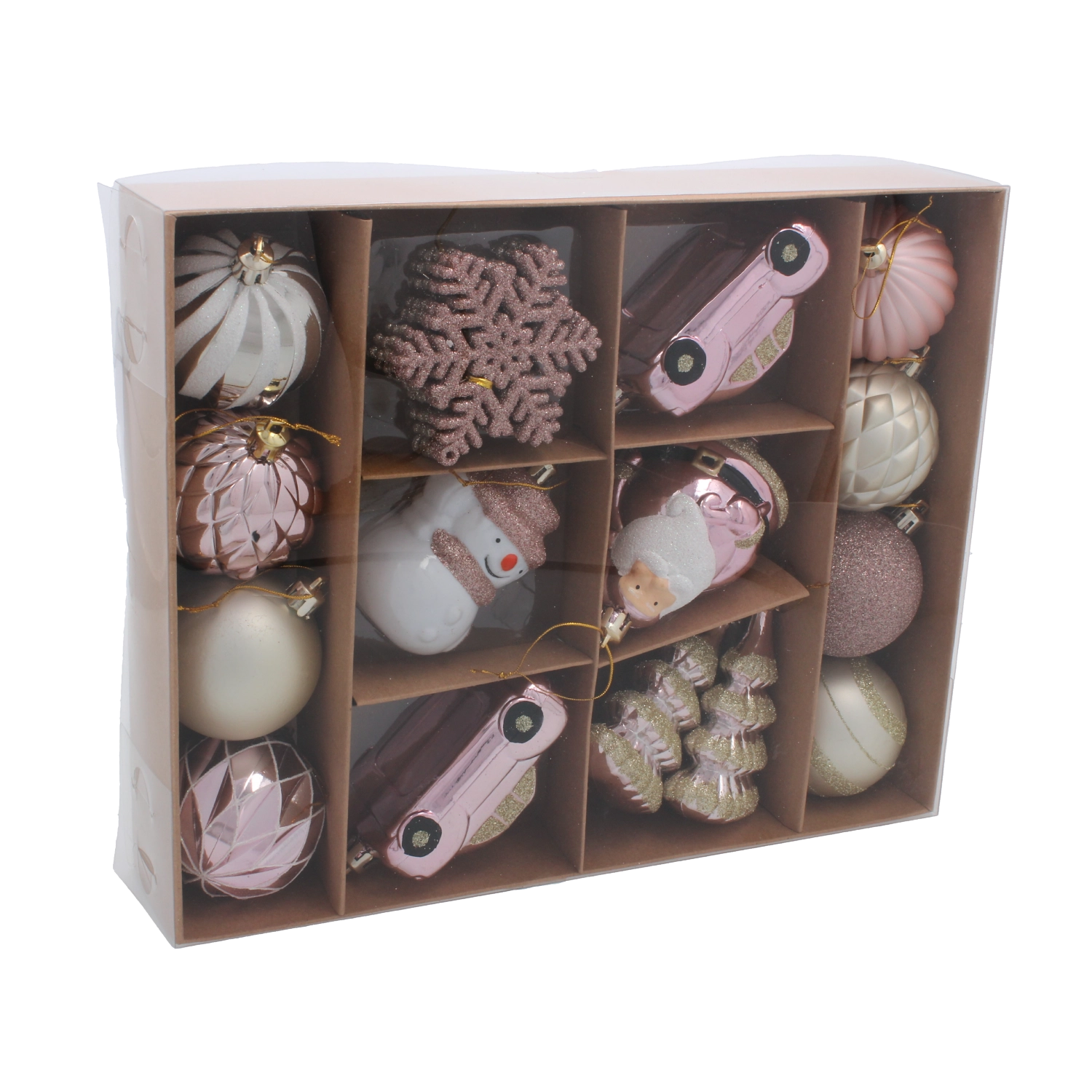 Adj ünnepeidnek modern csillogást a 20 darabos, rózsaszín és kék karácsonyi díszkészlettel. Az elegáns árnyalatok és a változatos formák kombinációja harmonikus, stílusos megjelenést teremt, amelyet könnyedén összehangolhatsz a többi dekorációval. A díszek minőségi műanyagból készültek, ezért könnyűek, törésállók, és ideálisak gyermekes vagy kisállatos háztartásokba. A praktikus csomagolás biztosítja a kényelmes tárolást a szezonon kívüli időszakban is.