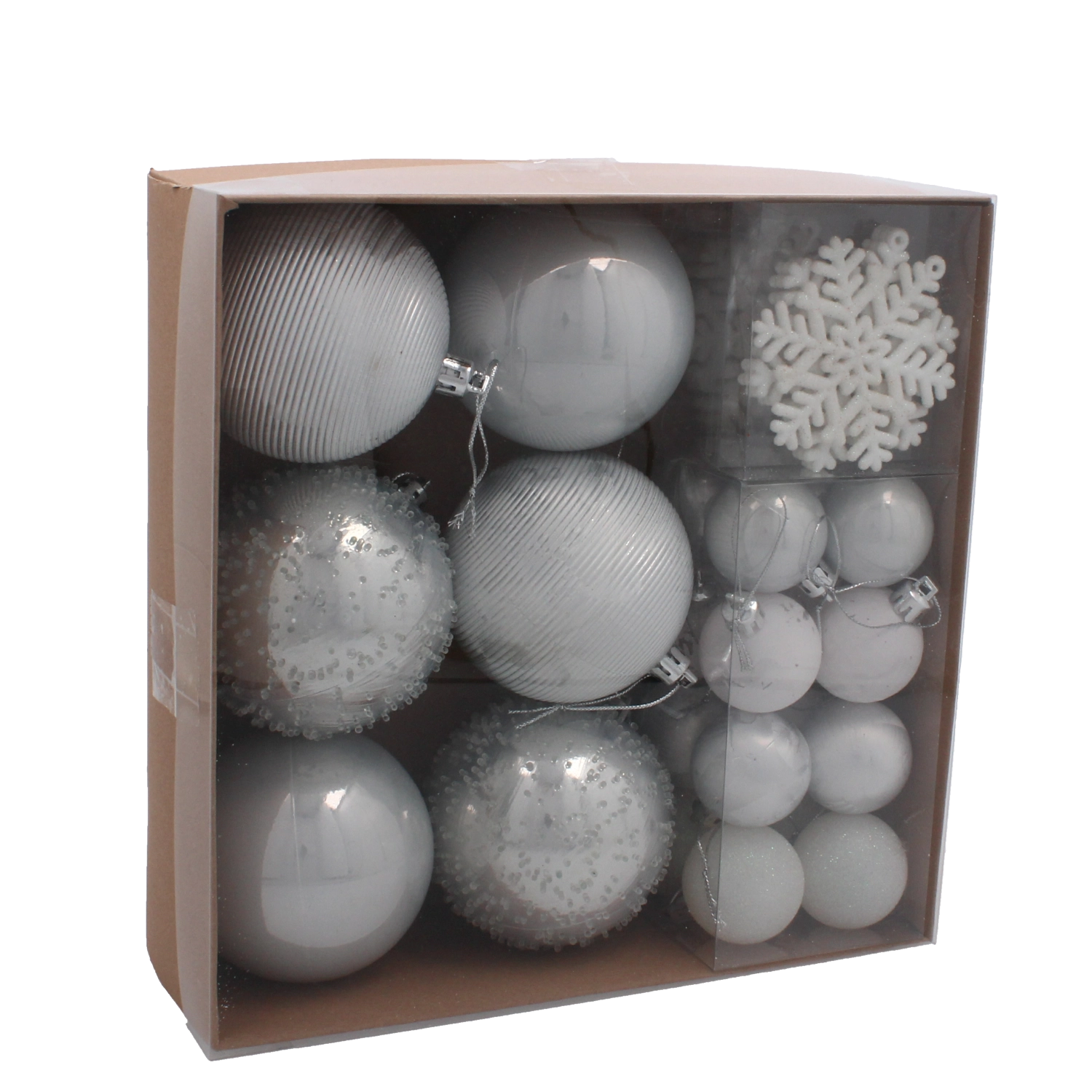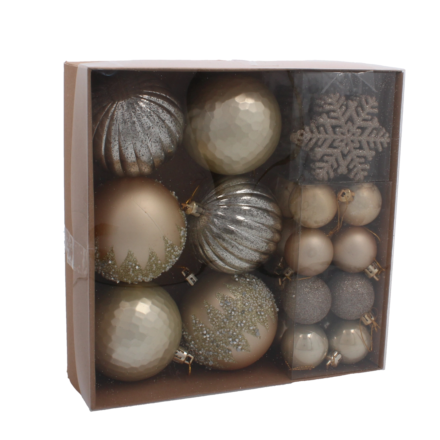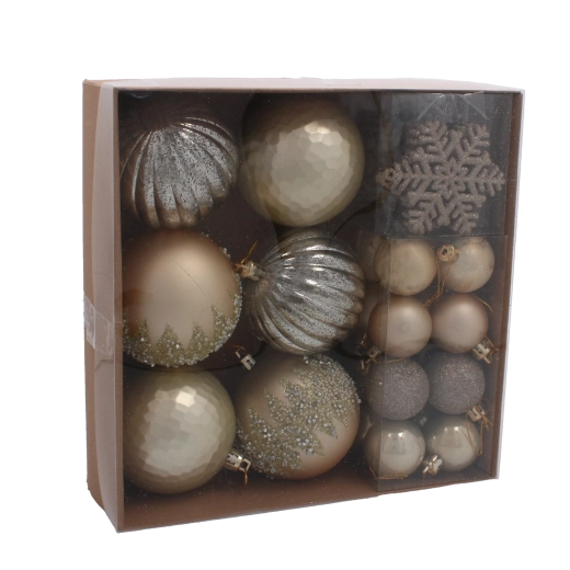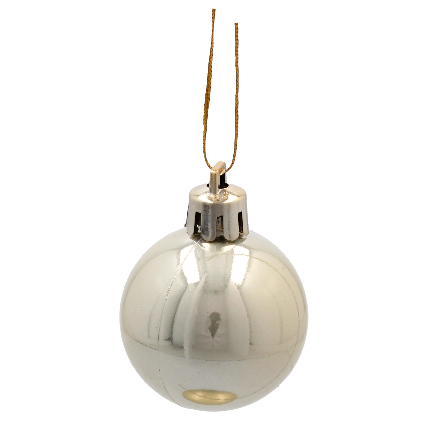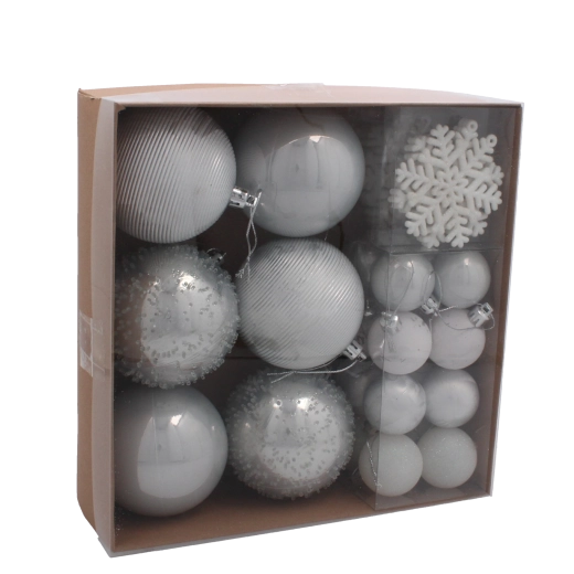 Ez a kiegyensúlyozott, 30 darabos gömbkollekció a meleg arany és hűvös ezüst árnyalatok tökéletes összhangját kínálja, amely bármelyik karácsonyfát felragyogtatja. A könnyű, tartós és törésbiztos műanyag megkönnyíti a felhelyezést, és biztonságot nyújt gyerekek és háziállatok mellett is. A sima, fényes, csillogó és domborított felületek változatossága mélységet, ritmust és friss, luxus hatást kölcsönöz.