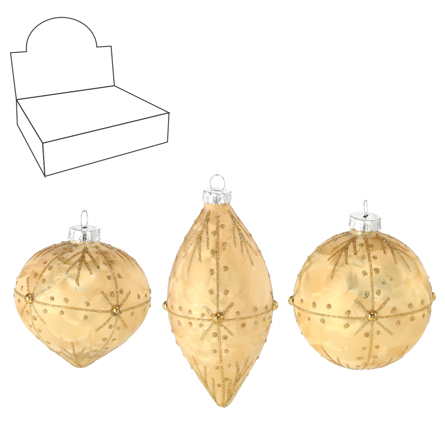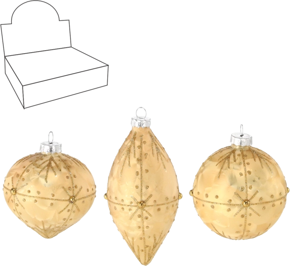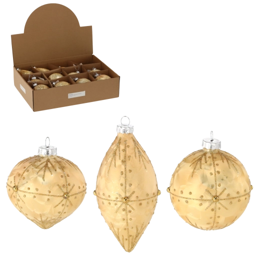Elegáns üveg karácsonyi díszek fényűző arany színben, amelyek valódi csillogást kölcsönöznek a fának. A szett vegyes formákat kombinál a látványos hatásért: gömb díszek 8 cm átmérővel és hosszúkás díszek 6 × 13 cm méretben. Kézzel díszített részletek és a klasszikus arany dizájn hangsúlyozzák az ünnepi hangulatot, és könnyen összehangolhatók más dekorációval.