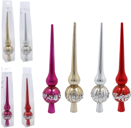 Válasszon piros, arany vagy ezüst változatot, és könnyedén hangolja össze a csúcsot a fa többi díszével.