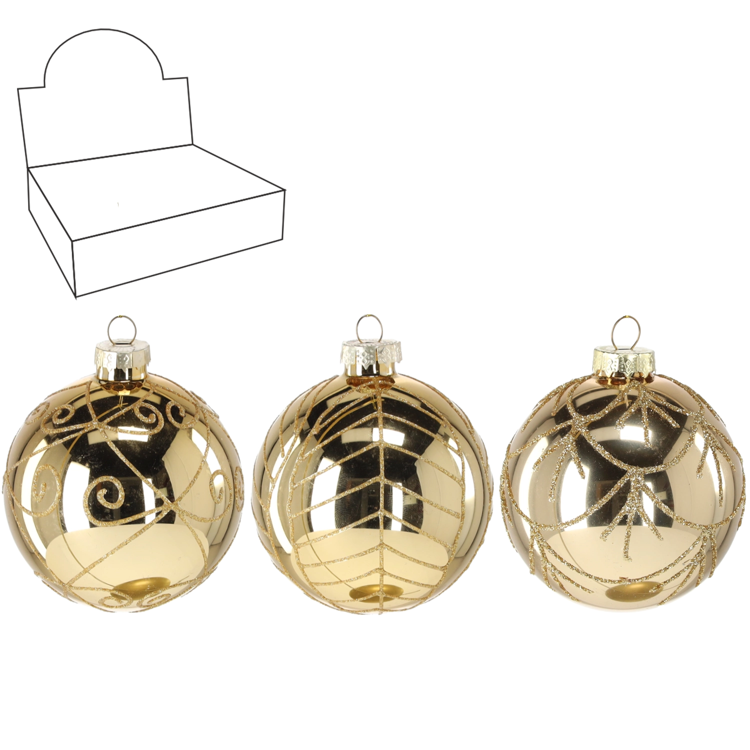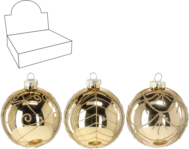Luxus minőségű, 8 cm átmérőjű üveg karácsonyi gömb, amely fájának eleganciát és arany ragyogást kölcsönöz. Kézi dekor brokátmintákkal különböző motívumokban, amely minden darab egyediségét és a többi díszhez való könnyű illeszkedést garantálja.