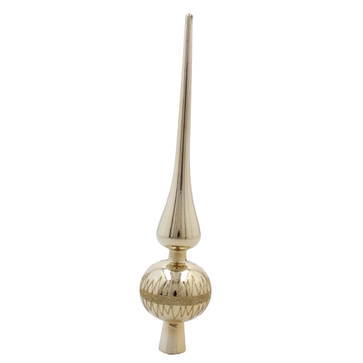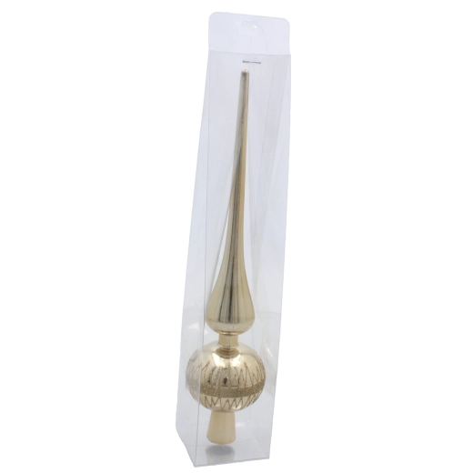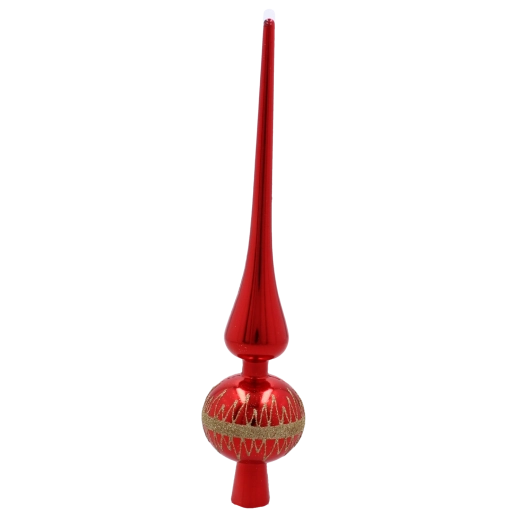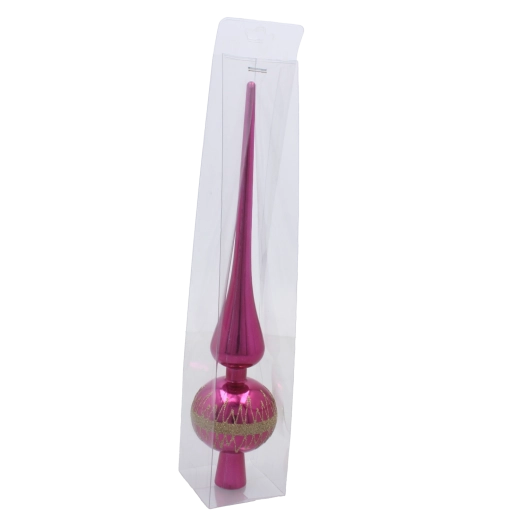 Elegáns, 28 cm magas üveg karácsonyfa-csúcs, amely díszítésének klasszikus megjelenést és ragyogó csillogást kölcsönöz. Időtálló formájának, könnyű üvegének és egyszerű felszerelésének köszönhetően szépen illik modern és hagyományos dekorációkhoz egyaránt. Különböző színekben kapható, hogy tökéletesen harmonizáljon a többi dísszel.