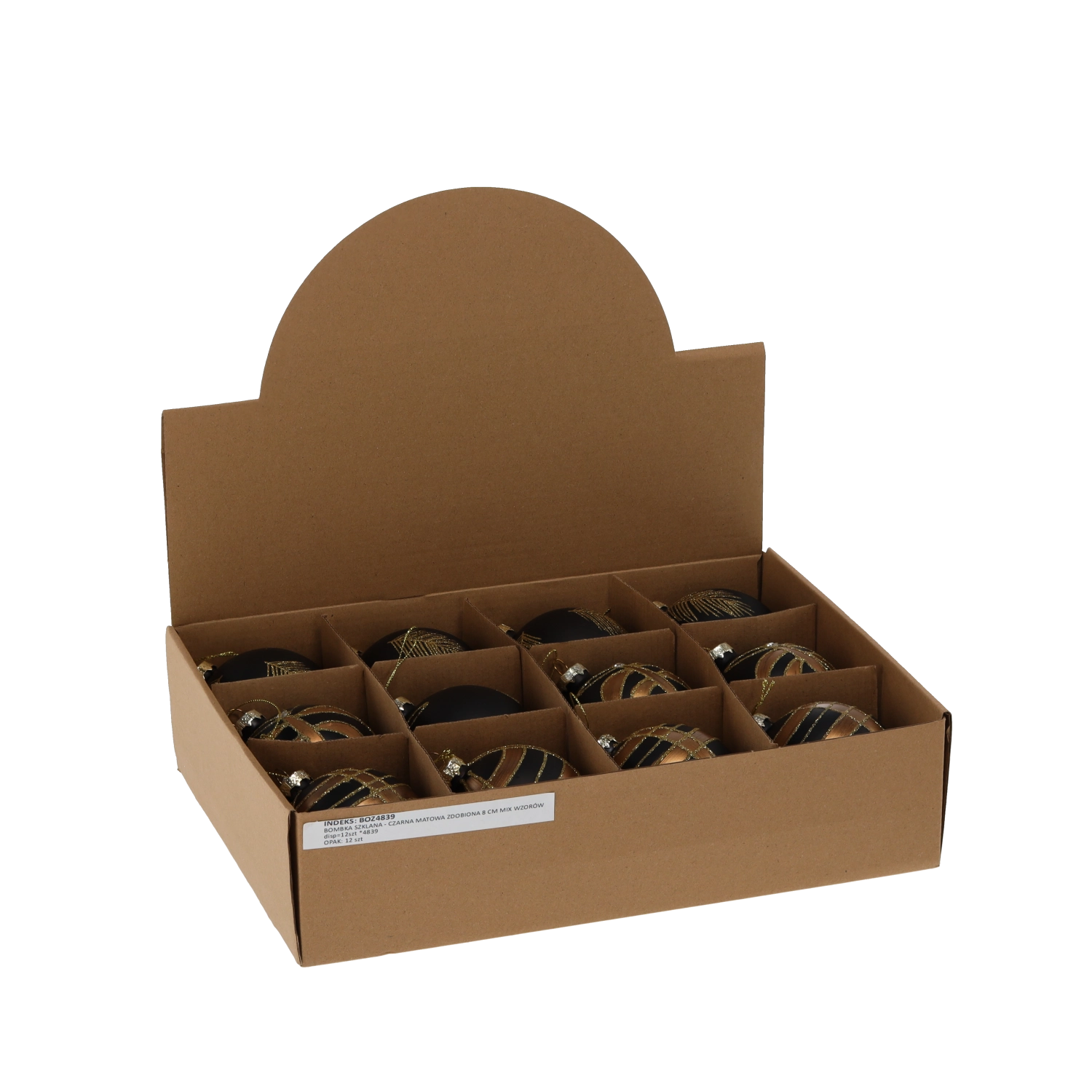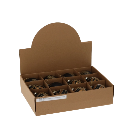 Üveg karácsonyi gömbök 8 cm, matt fekete arany díszítéssel, 12 darabos készlet