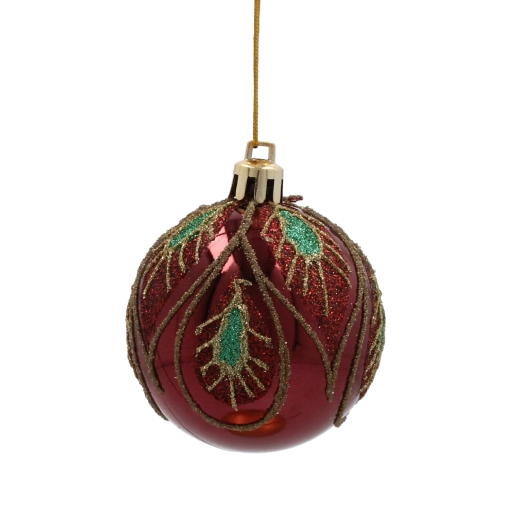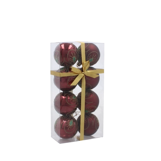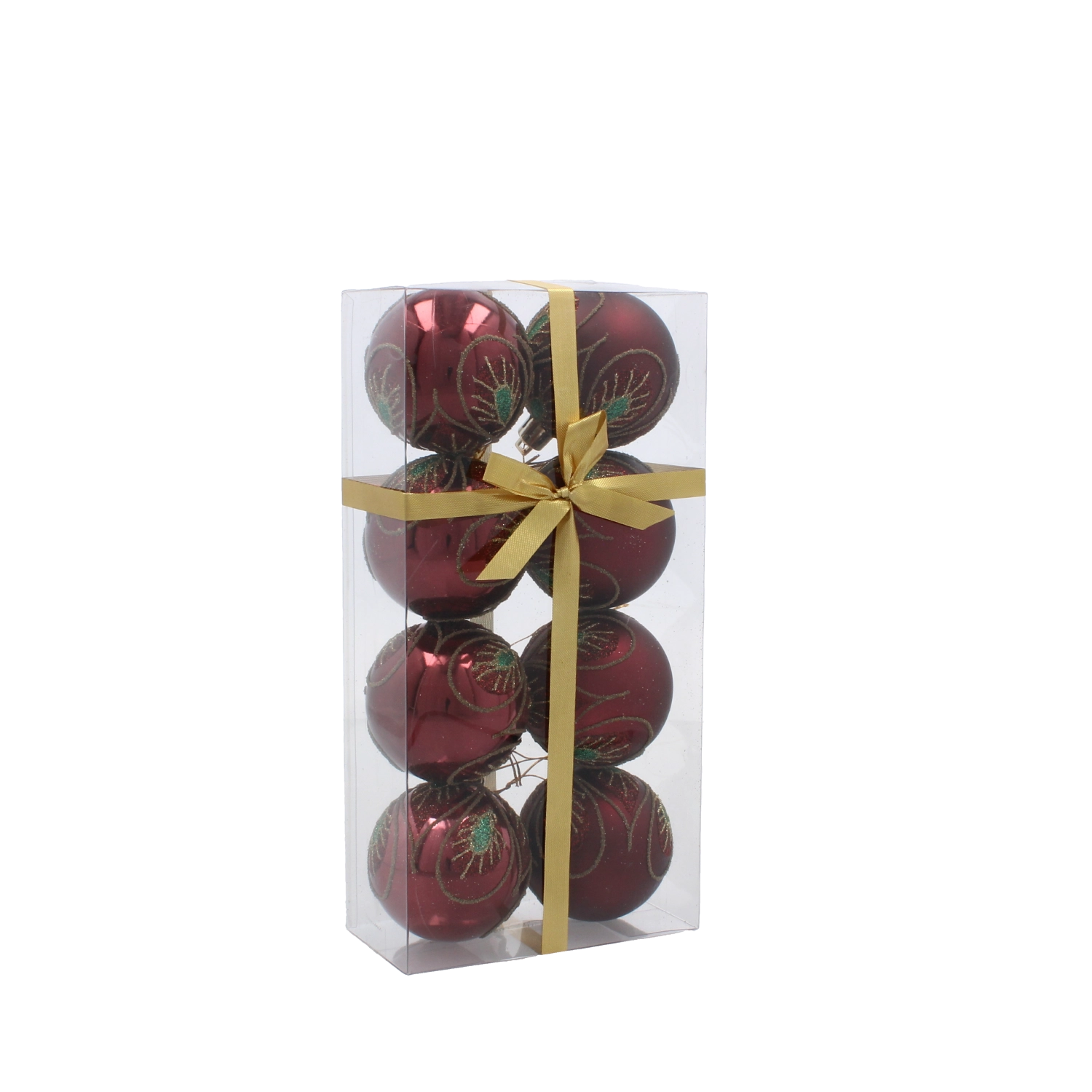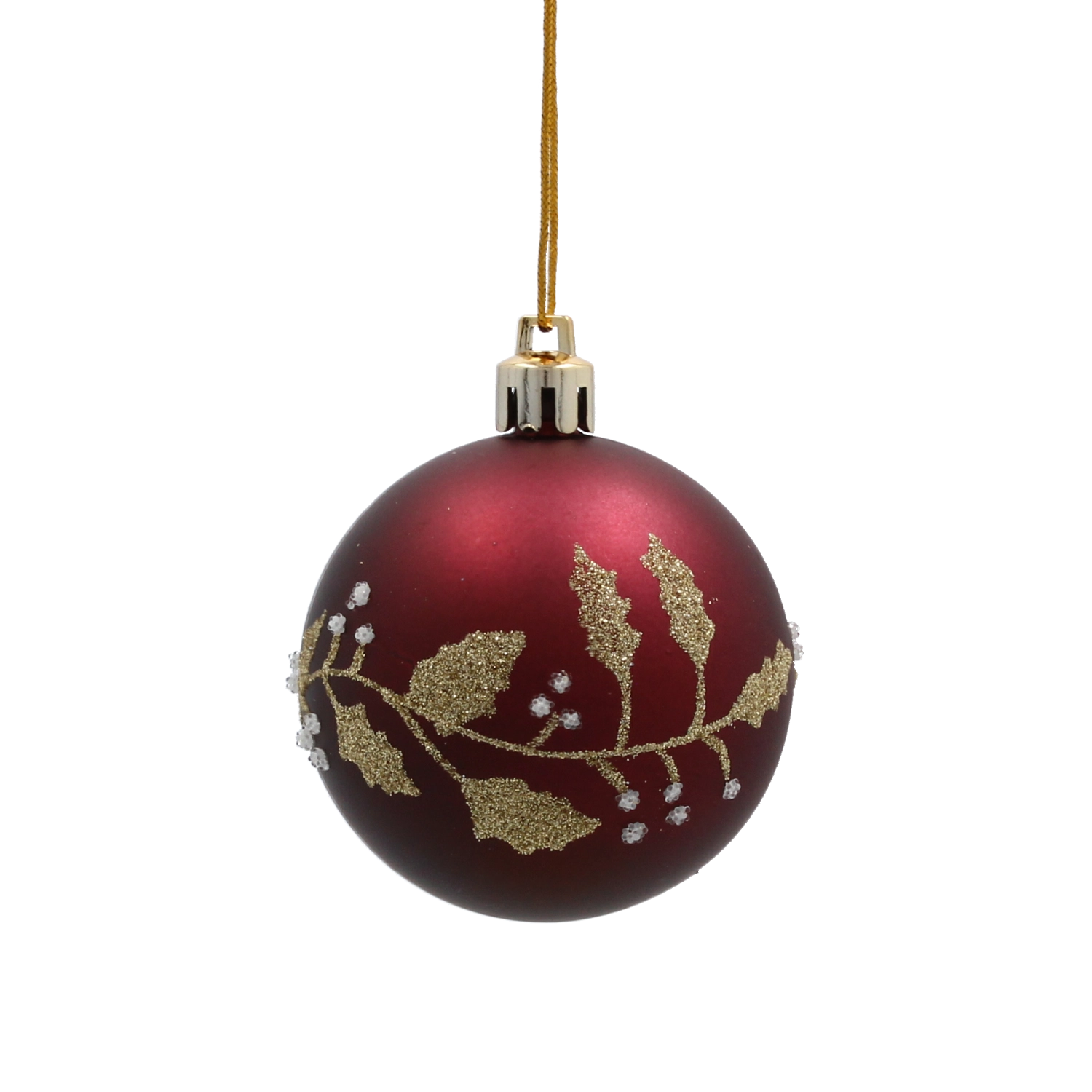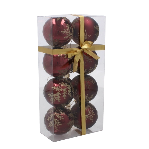 Varázsolj igazi ünnepi hangulatot otthonodba ezzel a nyolc darabos, 6 cm átmérőjű bordó karácsonyi gömbkészlettel. Minden dísz tartós műanyagból készült, elegáns arany leveles mintával és matt–fényes felületkombinációval, amely kifinomult csillogást és harmonikus kontrasztot kölcsönöz a fának. Könnyű kialakításuknak köszönhetően egyszerűen felakaszthatók, és ideálisak karácsonyfára, valamint ünnepi dekorációkhoz és koszorúkhoz is.