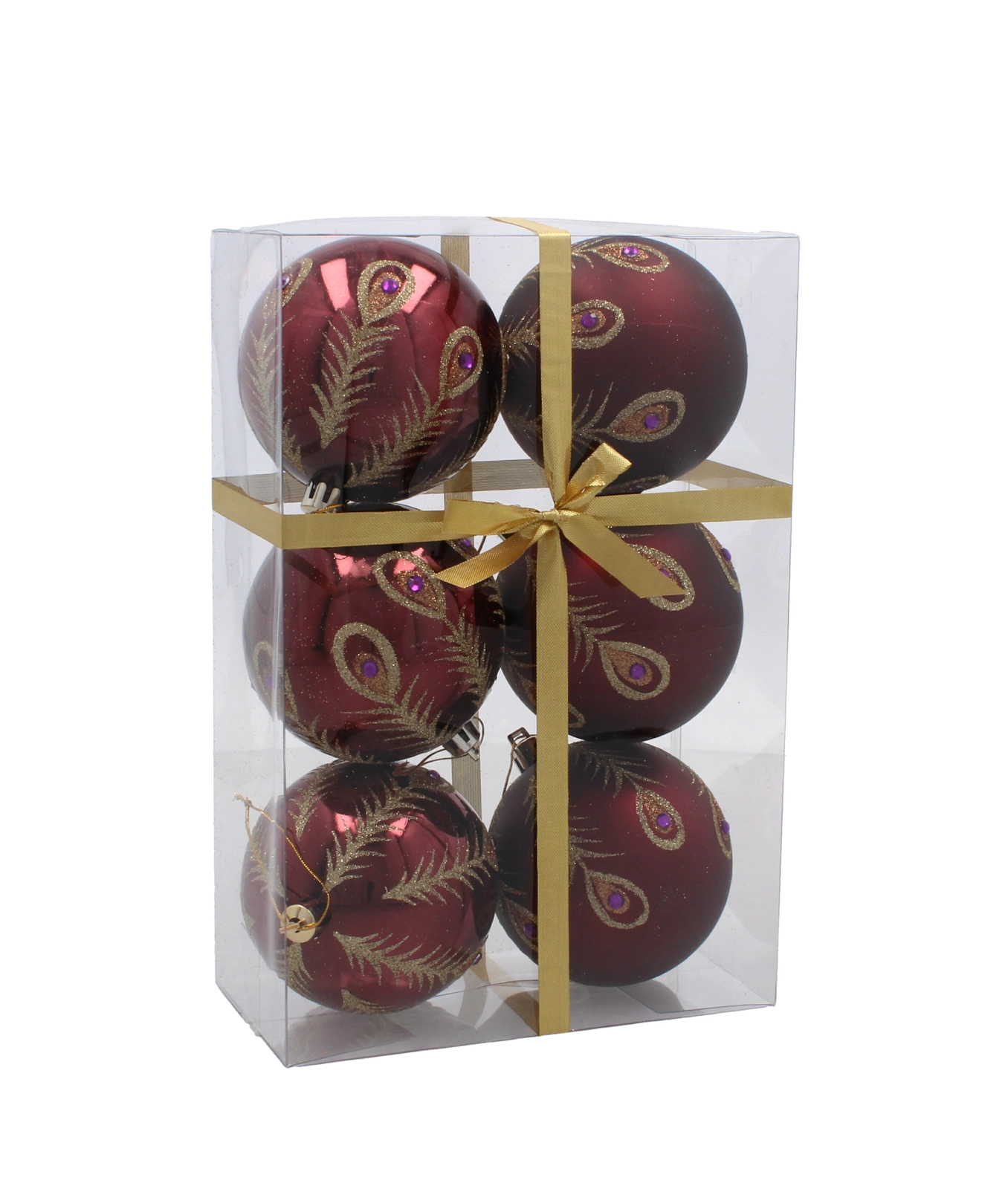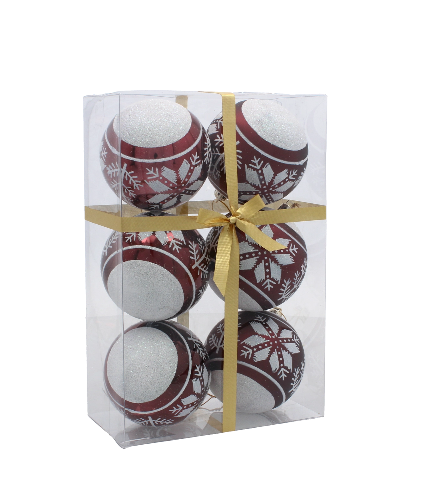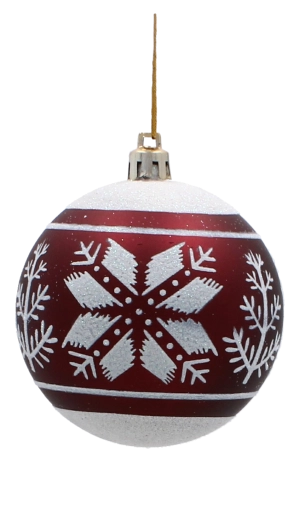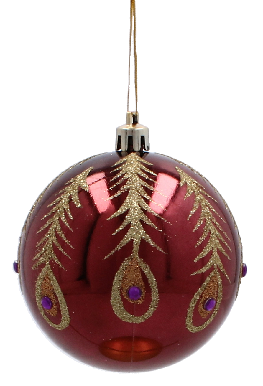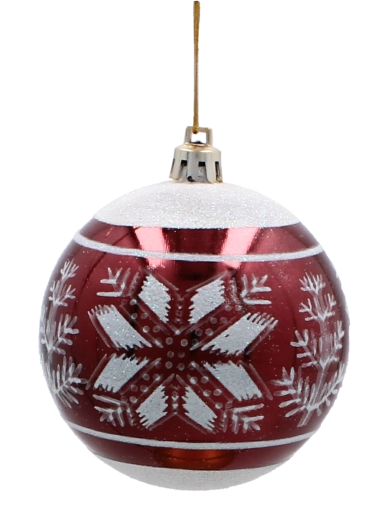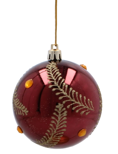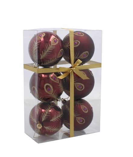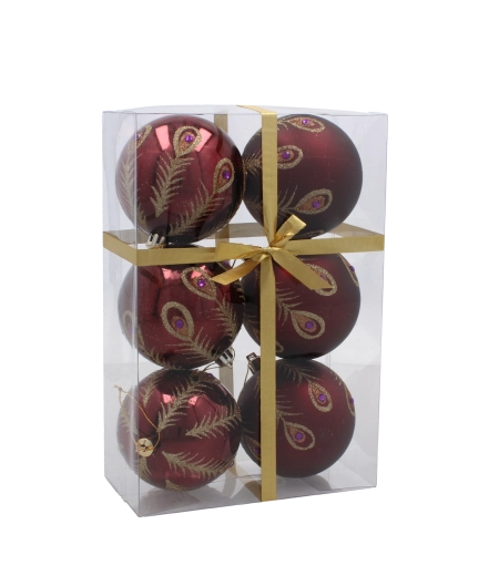 Ez a szett 6 gondosan összehangolt díszt tartalmaz gazdag bordó színben. Minden gömb finom arany motívumokkal díszített, és a matt és fényes felületek kombinációjával látványos kontrasztot és ünnepi ragyogást nyújt. Az univerzális 8 cm átmérő kisebb és nagyobb fákhoz egyaránt illik, és könnyen kombinálható más dekorációkkal.