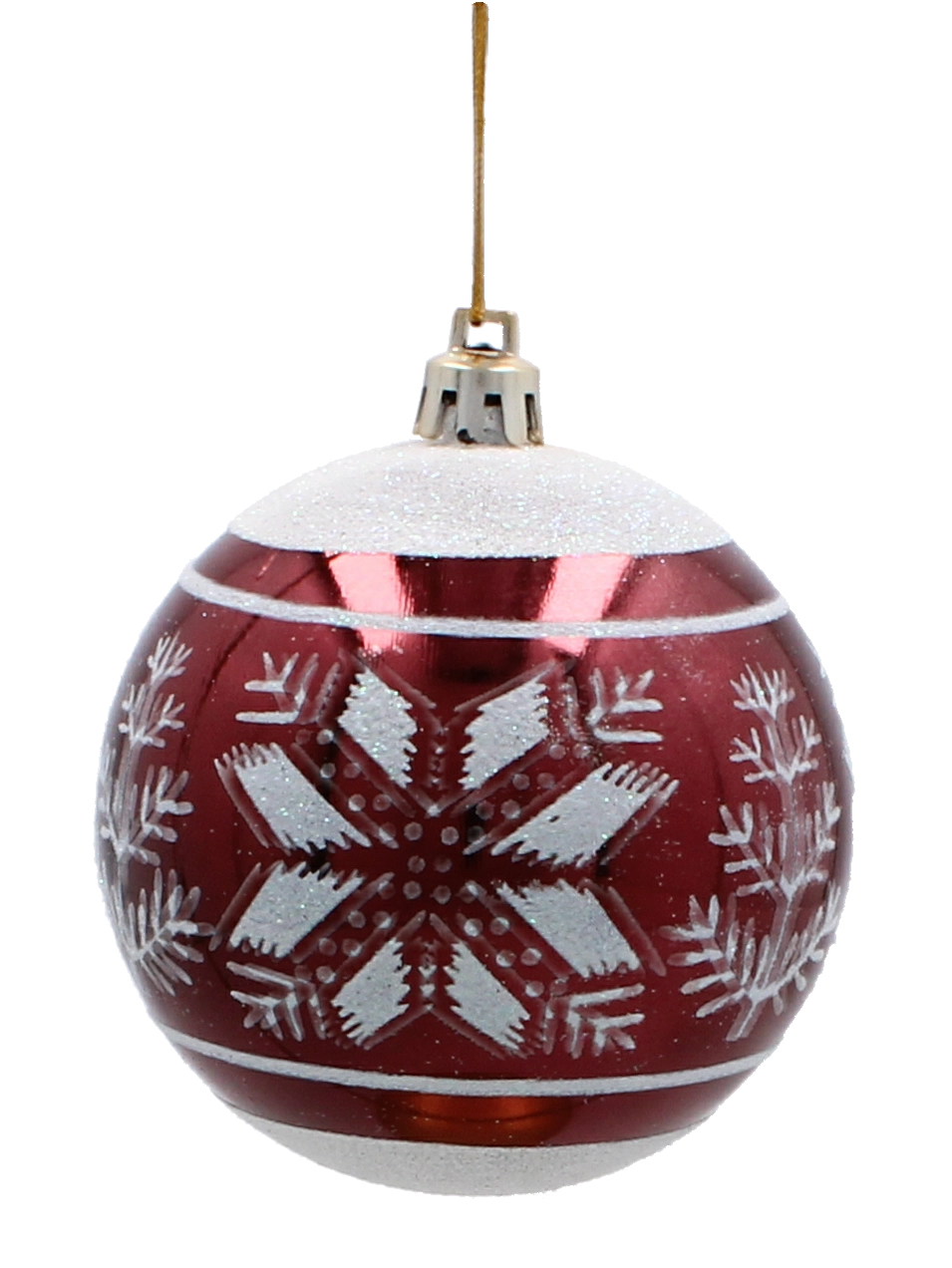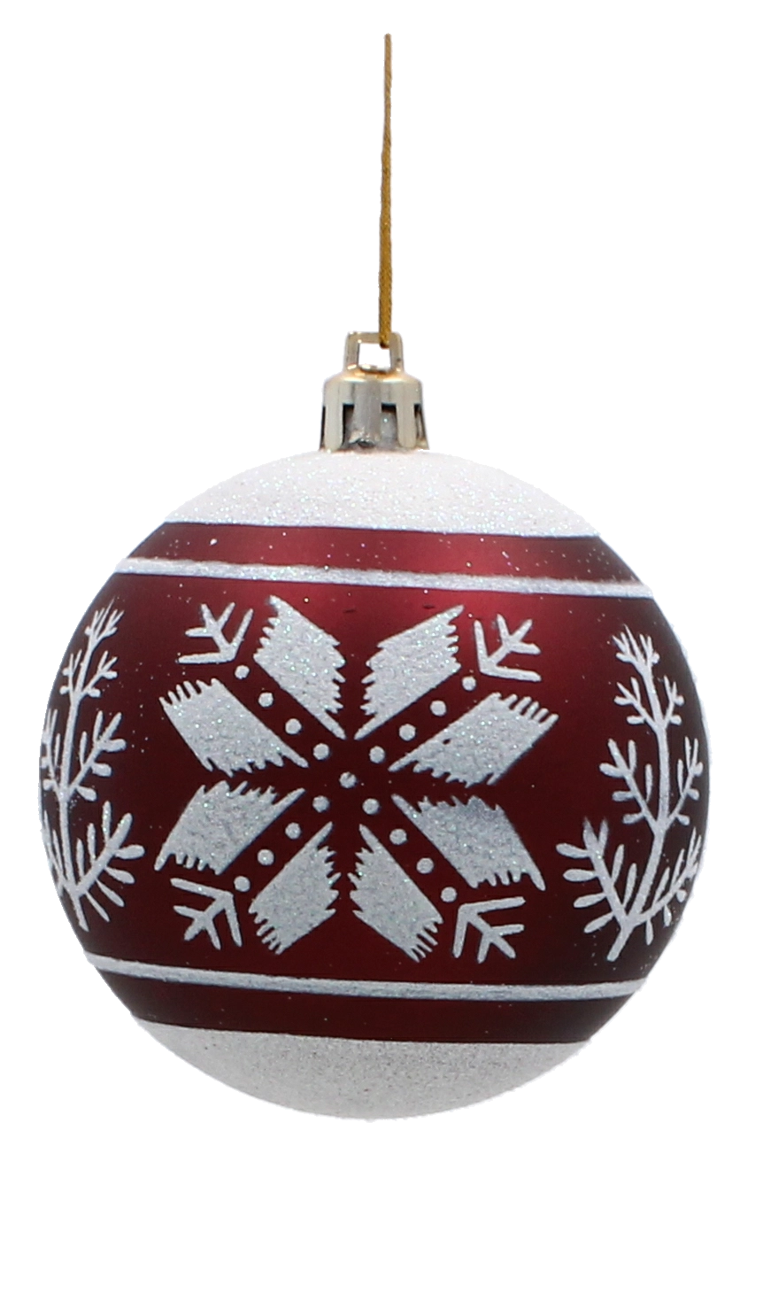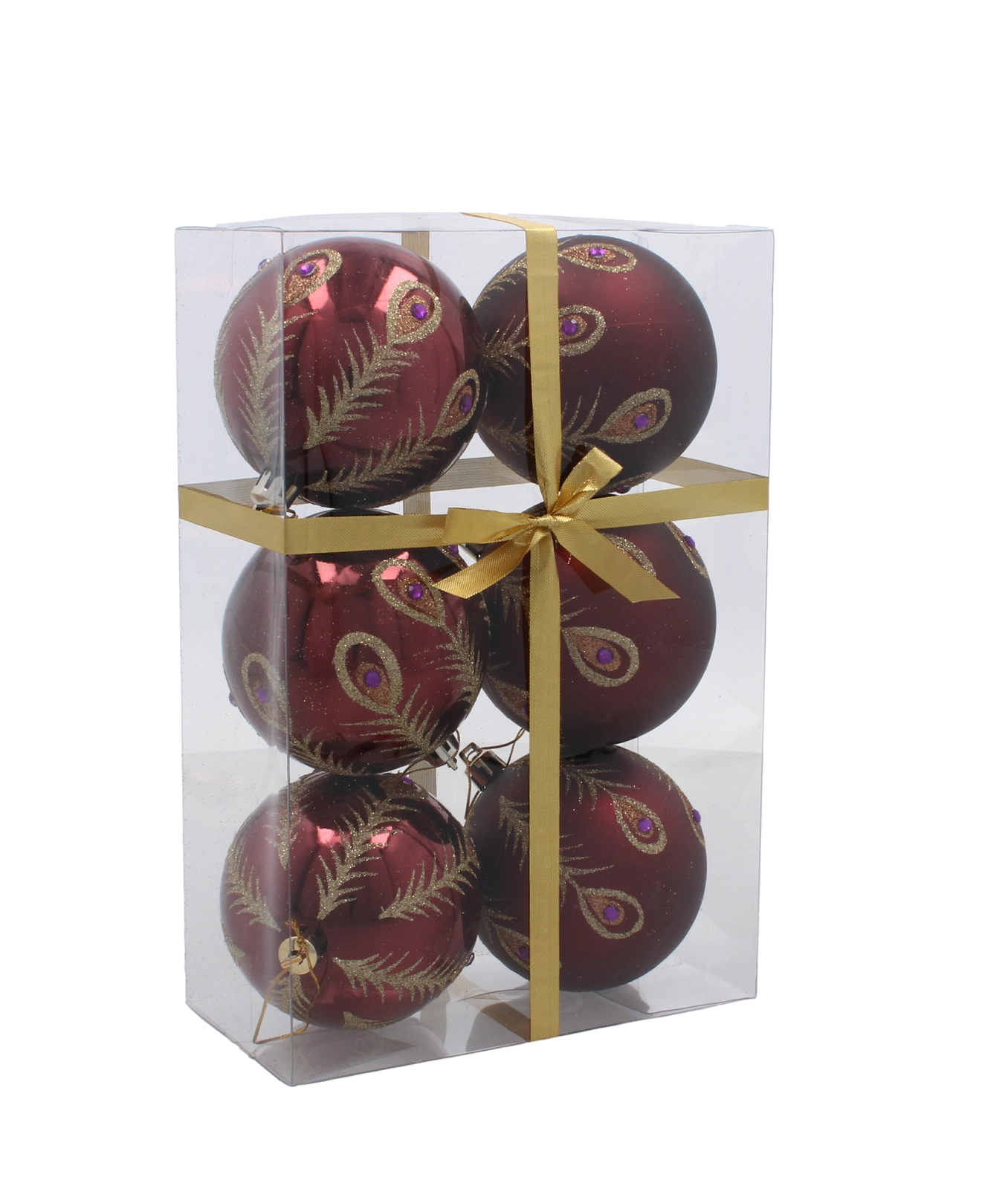 Ez a szett 6 gondosan összehangolt díszt tartalmaz gazdag bordó színben. Minden gömb finom arany motívumokkal díszített, és a matt és fényes felületek kombinációjával látványos kontrasztot és ünnepi ragyogást nyújt. Az univerzális 8 cm átmérő kisebb és nagyobb fákhoz egyaránt illik, és könnyen kombinálható más dekorációkkal.