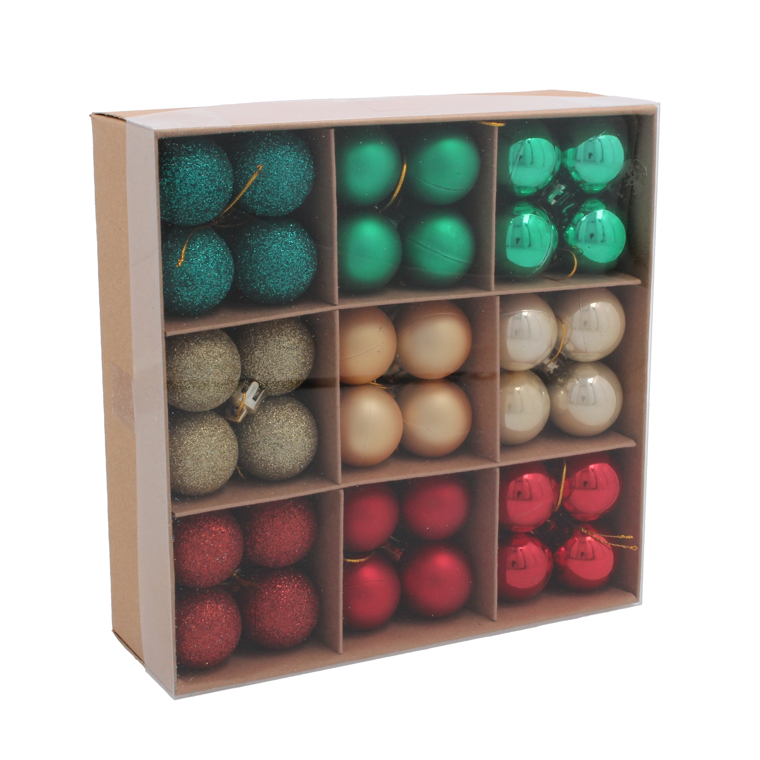 Ez az univerzális karácsonyi gömbszett praktikus dobozban érkezik, bőséges szín- és felületválasztékkal, hogy tökéletesen illeszkedjen a többi dekorációhoz. A kompakt, 3 cm-es átmérő ideális a kisebb ágakra, mini fákra és kreatív DIY projektekhez.