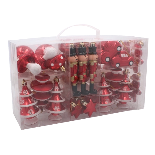 50 darabos karácsonyi díszkészlet piros, ezüst és arany színben